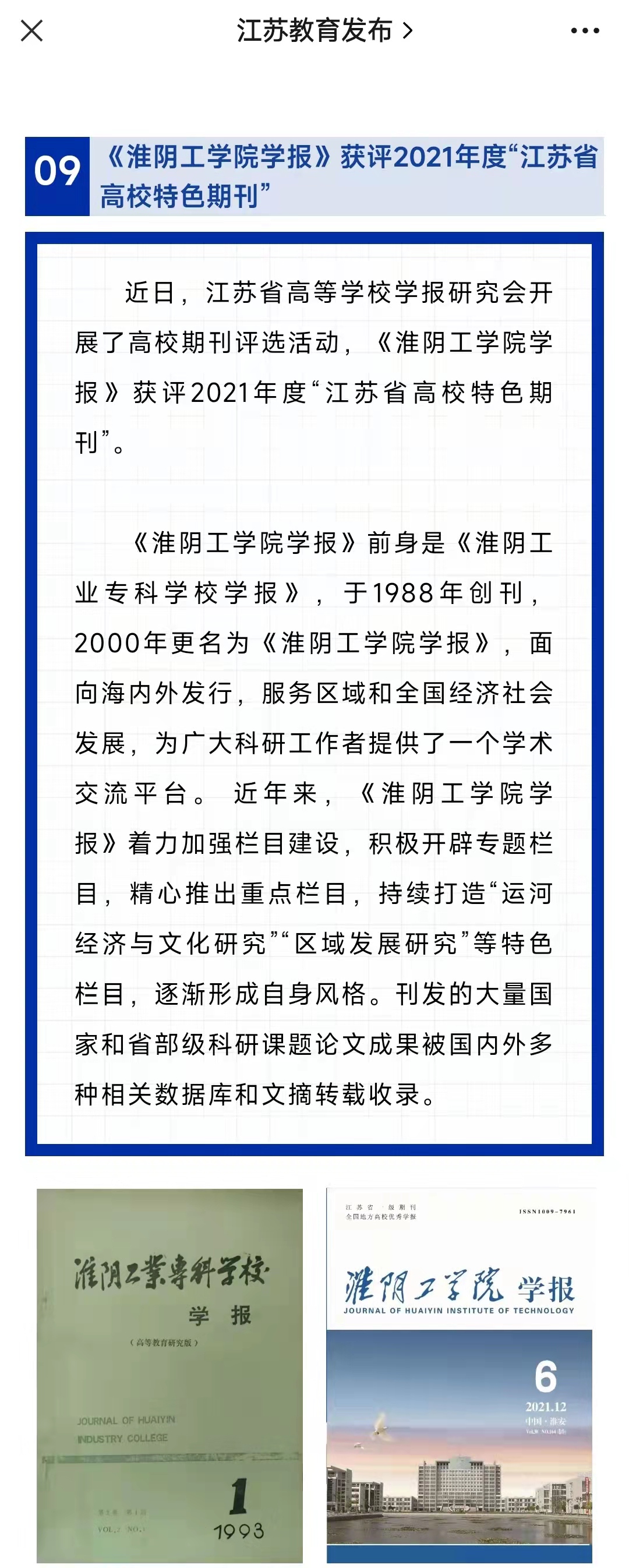 近日,江苏省高等学校学报研究会开展了高校期刊评选活动,《淮阴工学院学报》获评2021年度“江苏省高校特色期刊”。