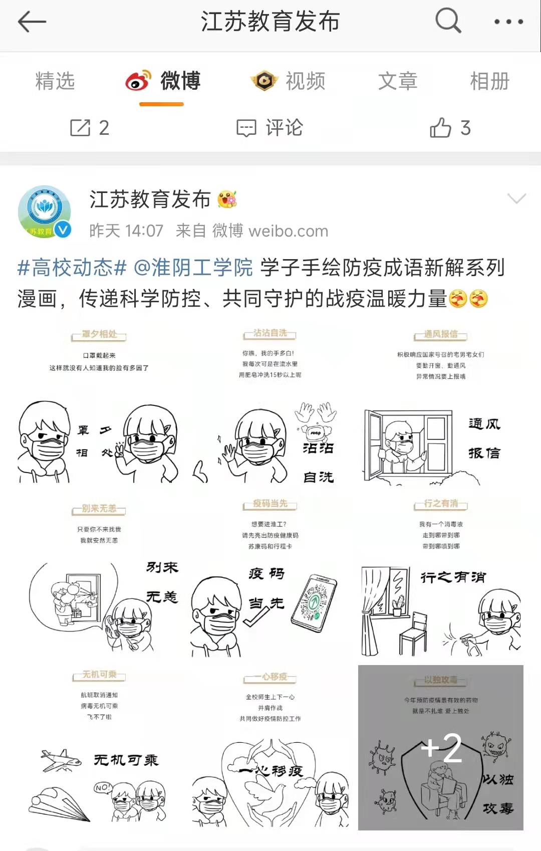 淮阴工学院学子手绘防疫成语新解系列漫画,传递科学防控、共同守护的战疫温暖力量。