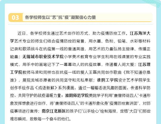 近日,各学校师生通过艺术创作的方式,助力疫情防控工作。淮阴工学院设计艺术学院学生创作手绘作品《成语新解》系列漫画,通过一幅幅活泼风趣的图画,传递科学防控、共同守护的战疫温暖力量。