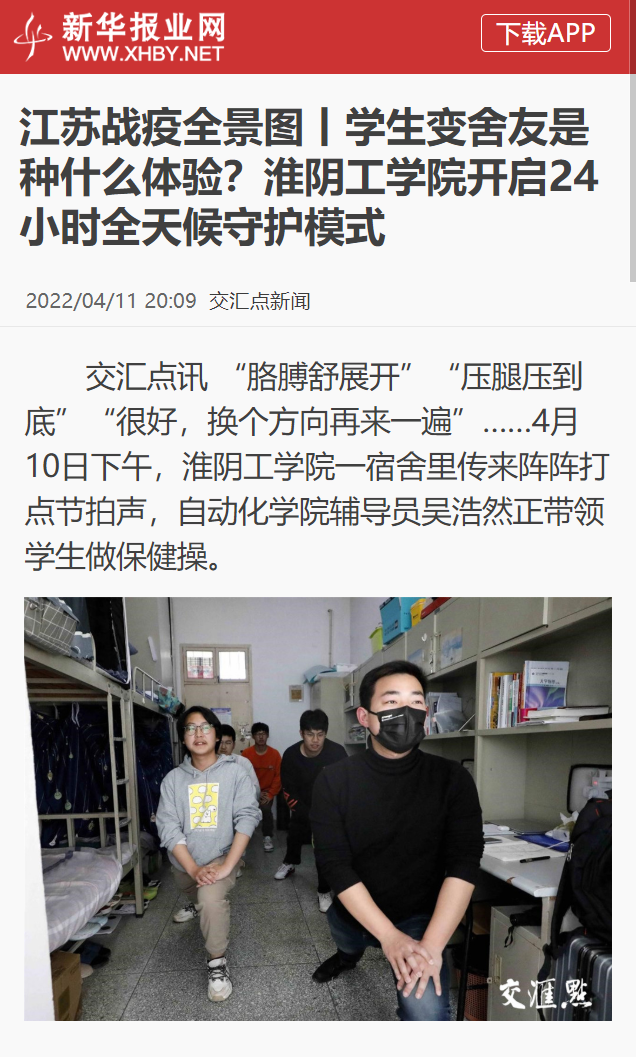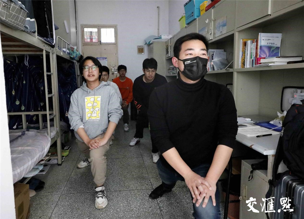 “胳膊舒展开”“压腿压到底”“很好,换个方向再来一遍”……4月10日下午,淮阴工学院一宿舍里传来阵阵打点节拍声,自动化学院辅导员吴浩然正带领学生做保健操。
