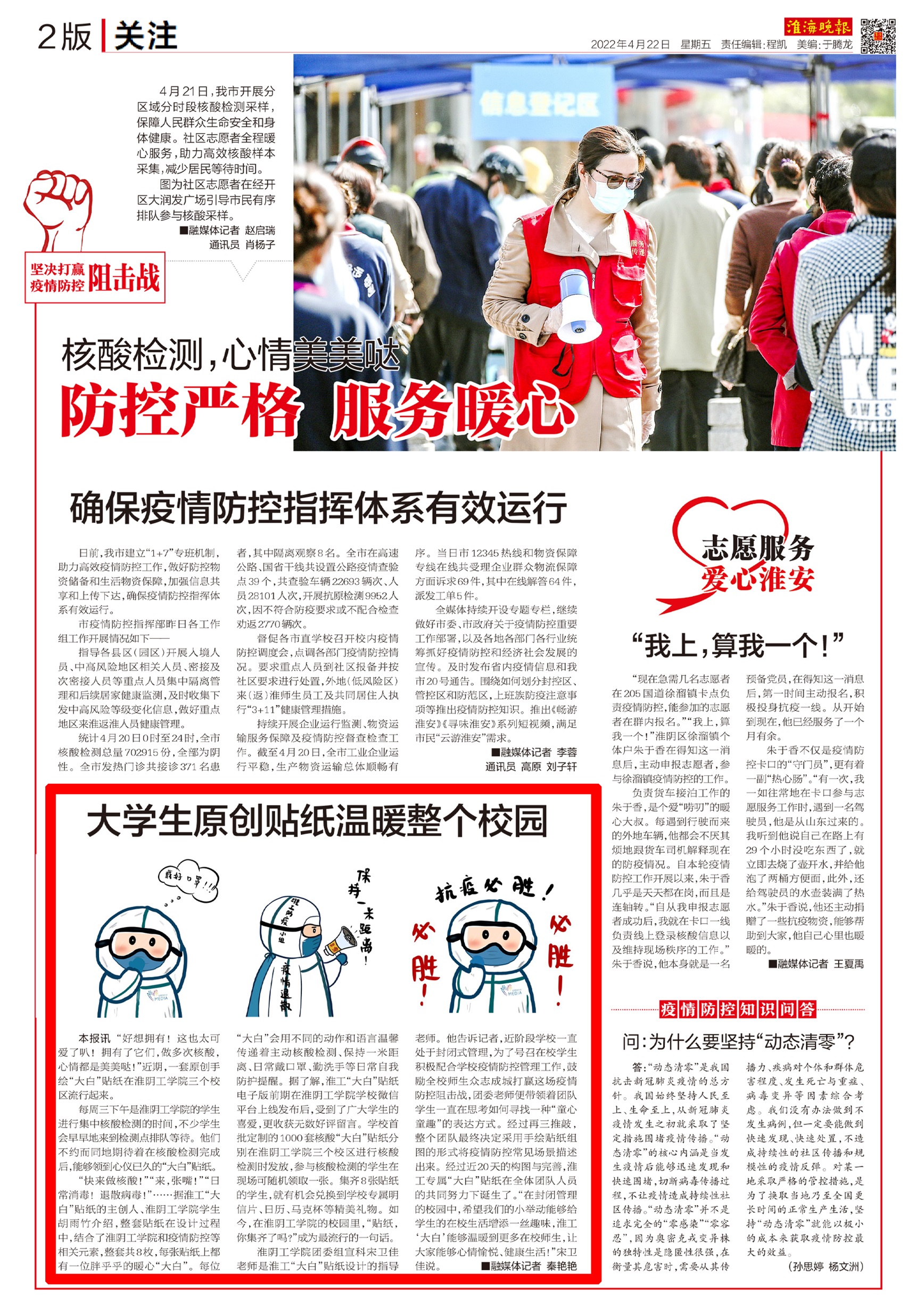 每周三下午是淮阴工学院的学生进行集中核酸检测的时间,不少学生会早早地来到检测点排队等待。他们不约而同地期待着在核酸检测完成后,能够领到心仪已久的“大白”贴纸。