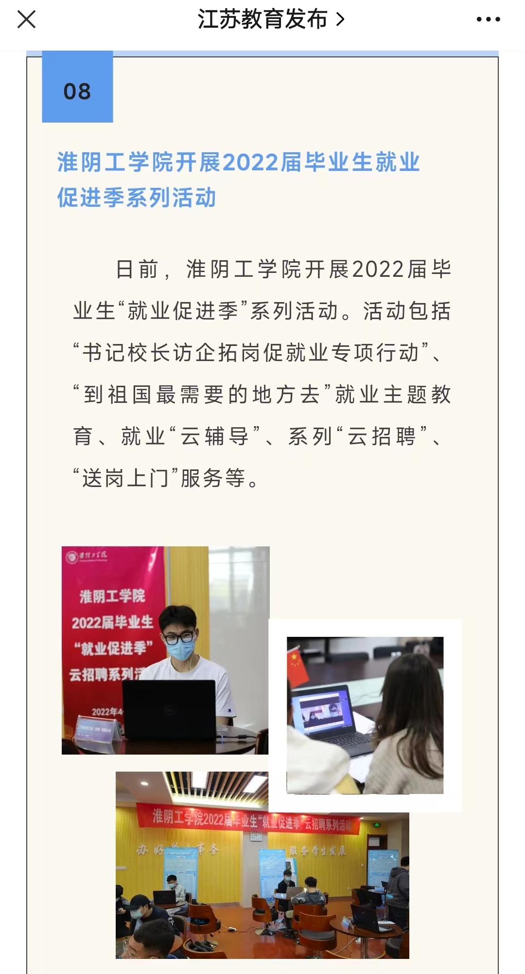 日前,淮阴工学院开展2022届毕业生“就业促进季”系列活动。活动包括“书记校长访企拓岗促就业专项行动”、“到祖国最需要的地方去”就业主题教育、就业“云辅导”、系列“云招聘”、“送岗上门”服务等。