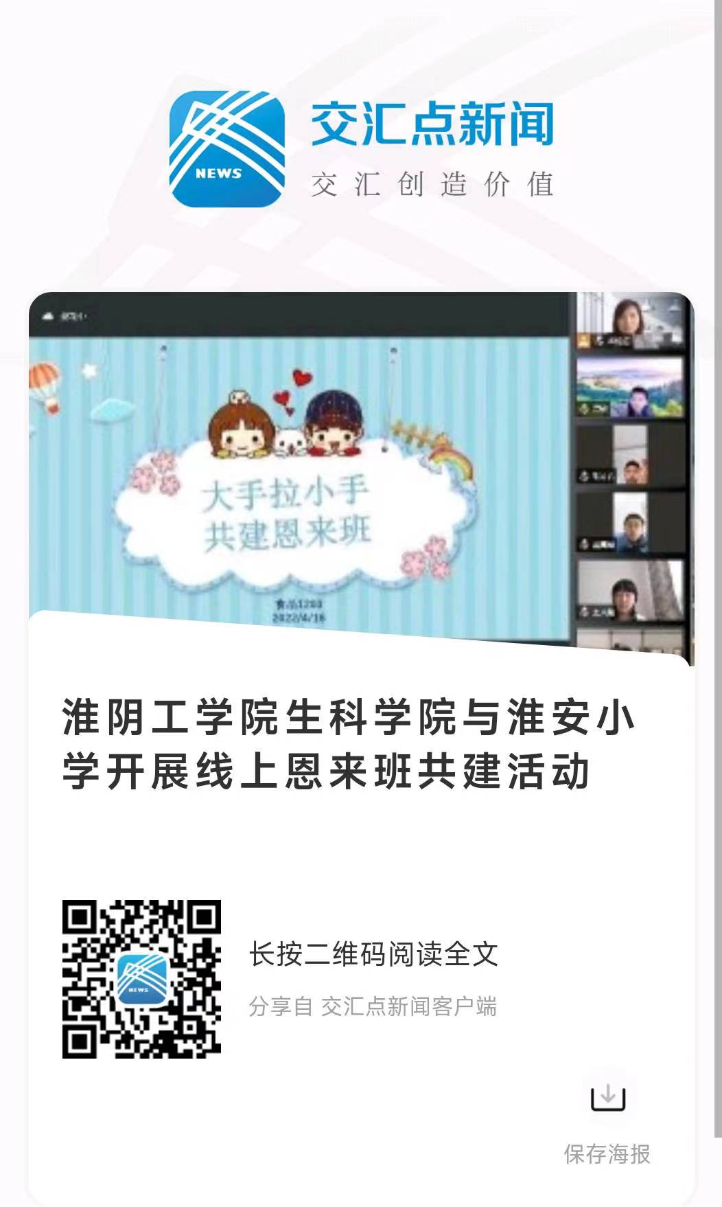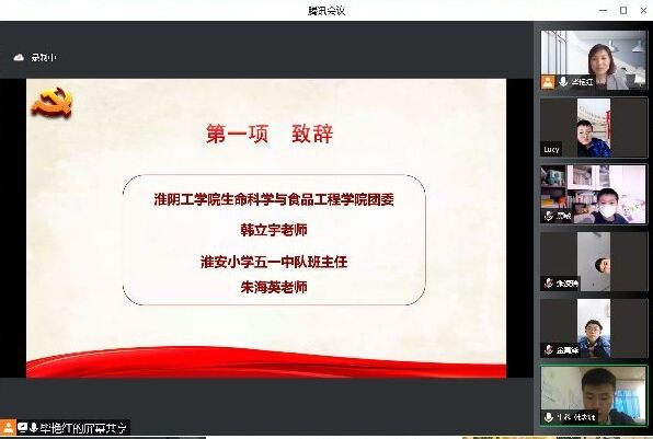 4月16日下午,淮阴工学院生科学院与淮安小学五一中队通过视频连线的方式,开展“大手拉小手,共建恩来班”主题活动。淮安小学五一中队班主任朱海英老师及全体同学、淮阴工学院食品系教工党支部教师代表、生科学院团委负责老师、学生支部党员代表、生科学院“周恩来班”学生代表及“周恩来班”创建班级学生代表参与此次活动。