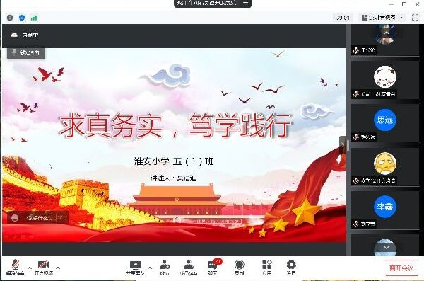 活动分为“讲恩来故事,看校园生活”、“学恩来精神,交流与分享”、“行恩来精神,一起来倡议”等几个部分。学生支部党员代表、“周恩来班”学生代表、“周恩来班”创建班级学生代表、淮安小学五一中队学生代表分别从不同角度进行故事讲述,分享周总理“勇于创新,严于自律”“无私奉献,甘做人民公仆”“积极进取,刻苦好学”“求真务实,笃学践行”的精神和品质。