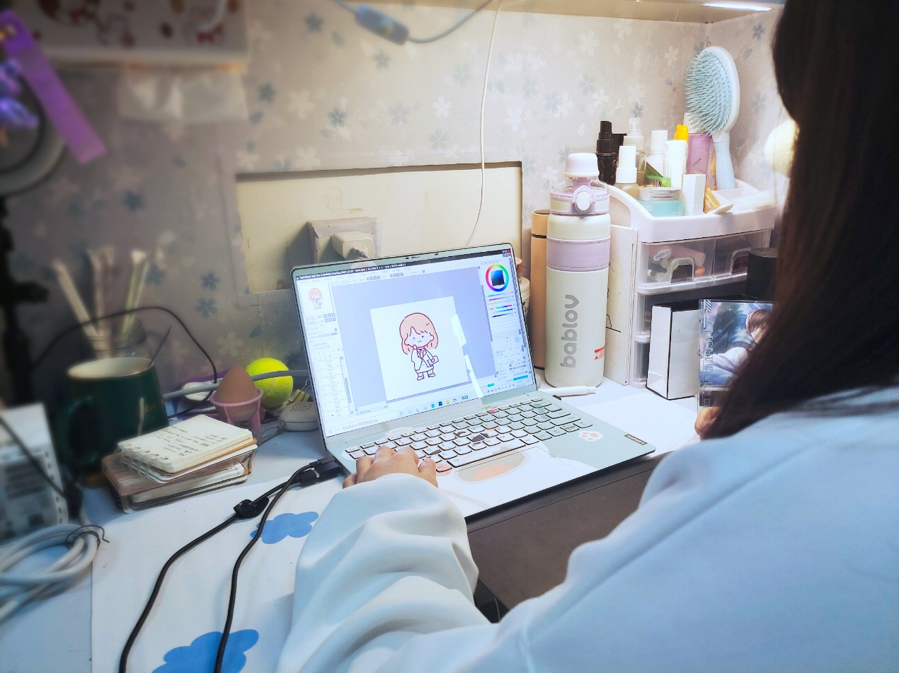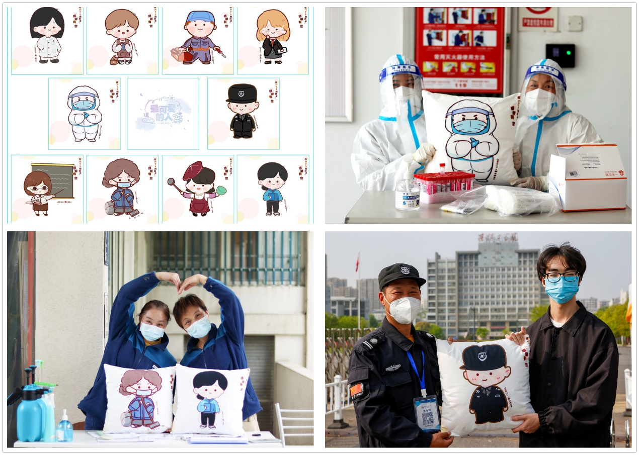 “双向奔赴的感情最温暖,因为有他们的默默守护,我们的生活才充满阳光,我们也想为他们做点什么。”淮阴工学院融媒体中心记者团黄晓庆、孙宁怡、赵宇豪、陈昱衡、崔静怡、江云琪这六个年轻人用画笔描绘世界诉说情感,为身边最可爱的人设计专属人物形象,表达感谢与喜爱。在他们的笔下,志愿者、校医、老师、辅导员、宿管等十个可爱的卡通人物跃然纸上。“我们想将这些人物形象做成抱枕,在‘五一’那天送给这些可爱的人们。我们共同努力,定能战胜疫情。”设计部部长黄晓庆笑着说。