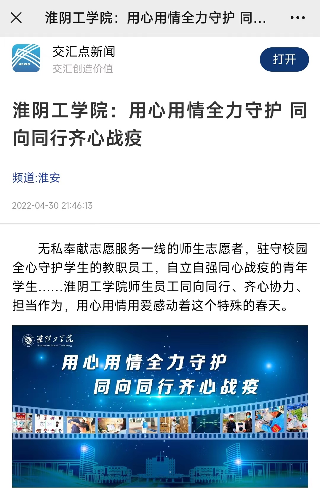 无私奉献志愿服务一线的师生志愿者,驻守校园全心守护学生的教职员工,自立自强同心战疫的青年学生……淮阴工学院师生员工同向同行、齐心协力、担当作为,用心用情用爱感动着这个特殊的春天。