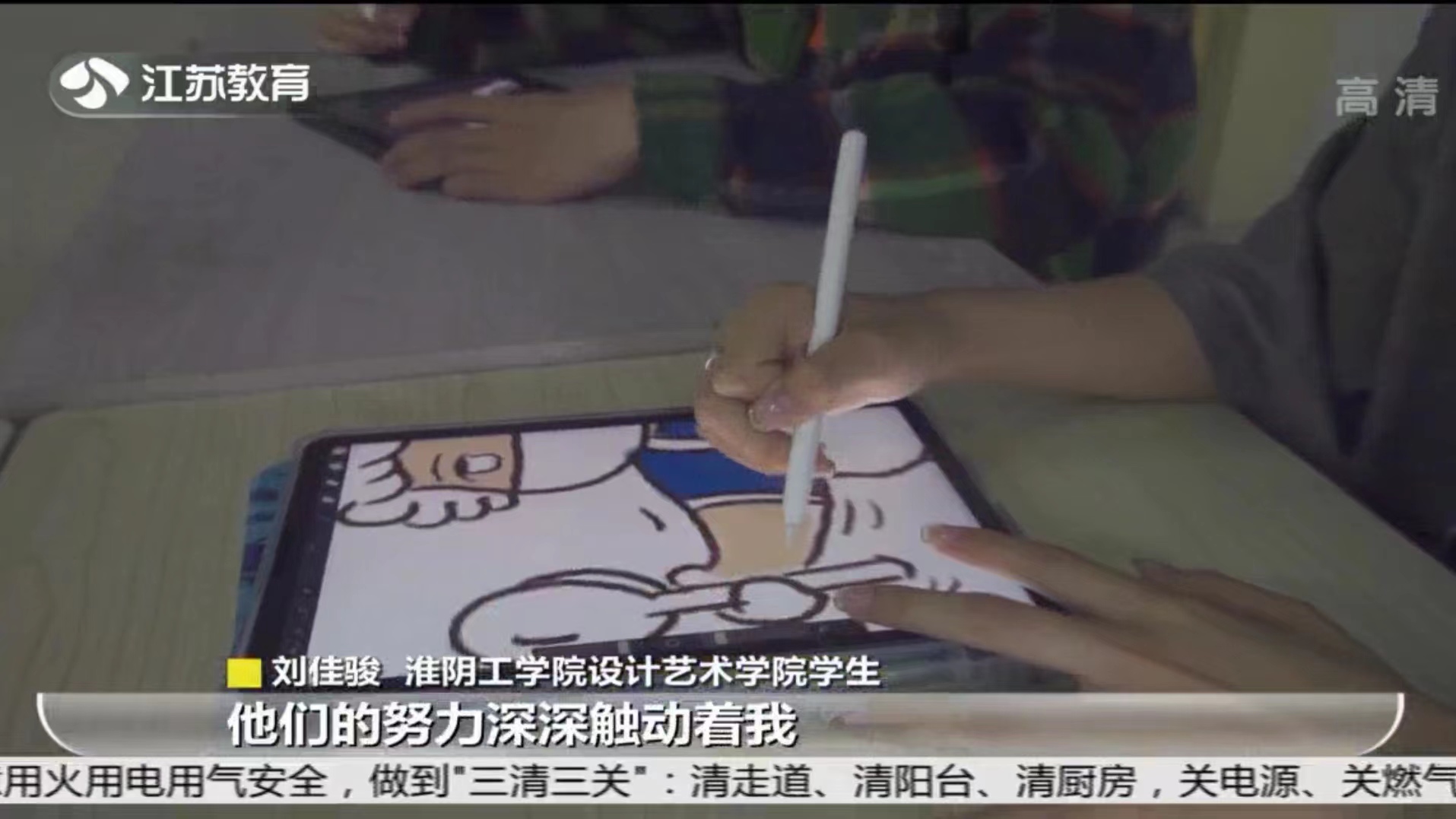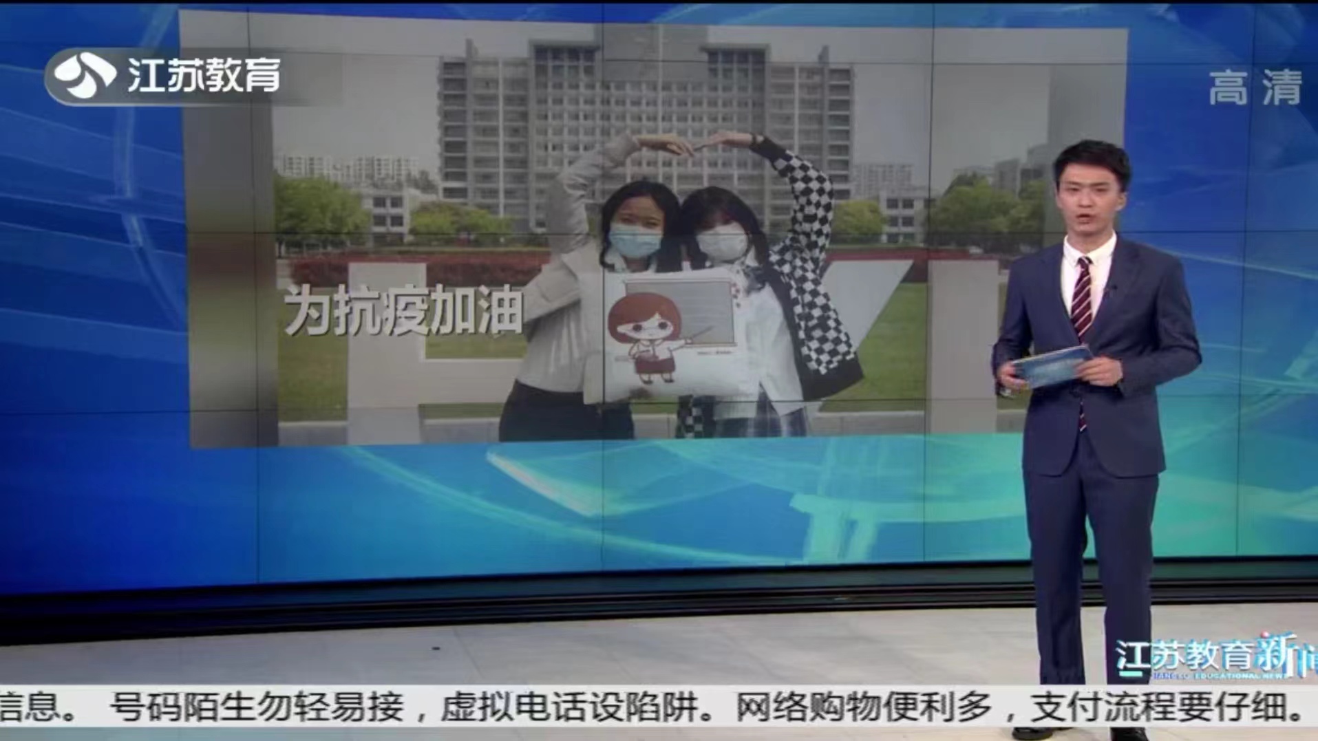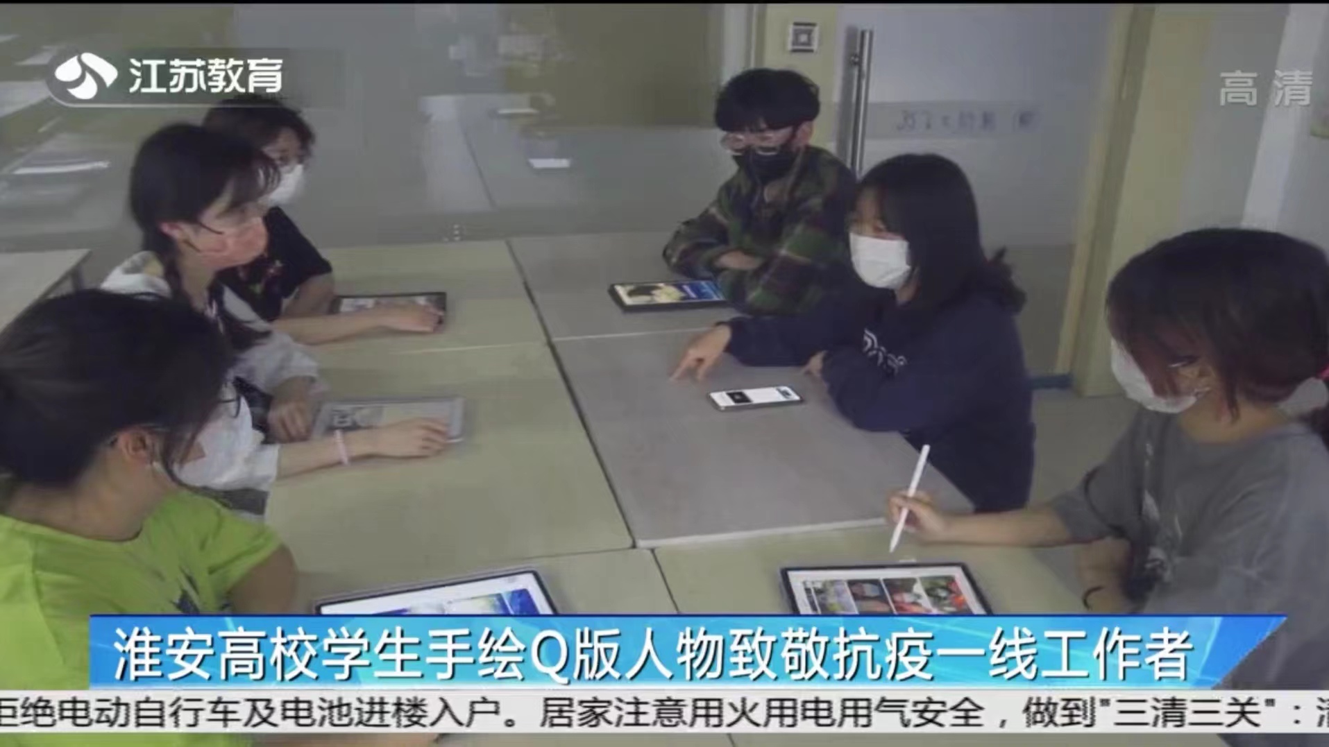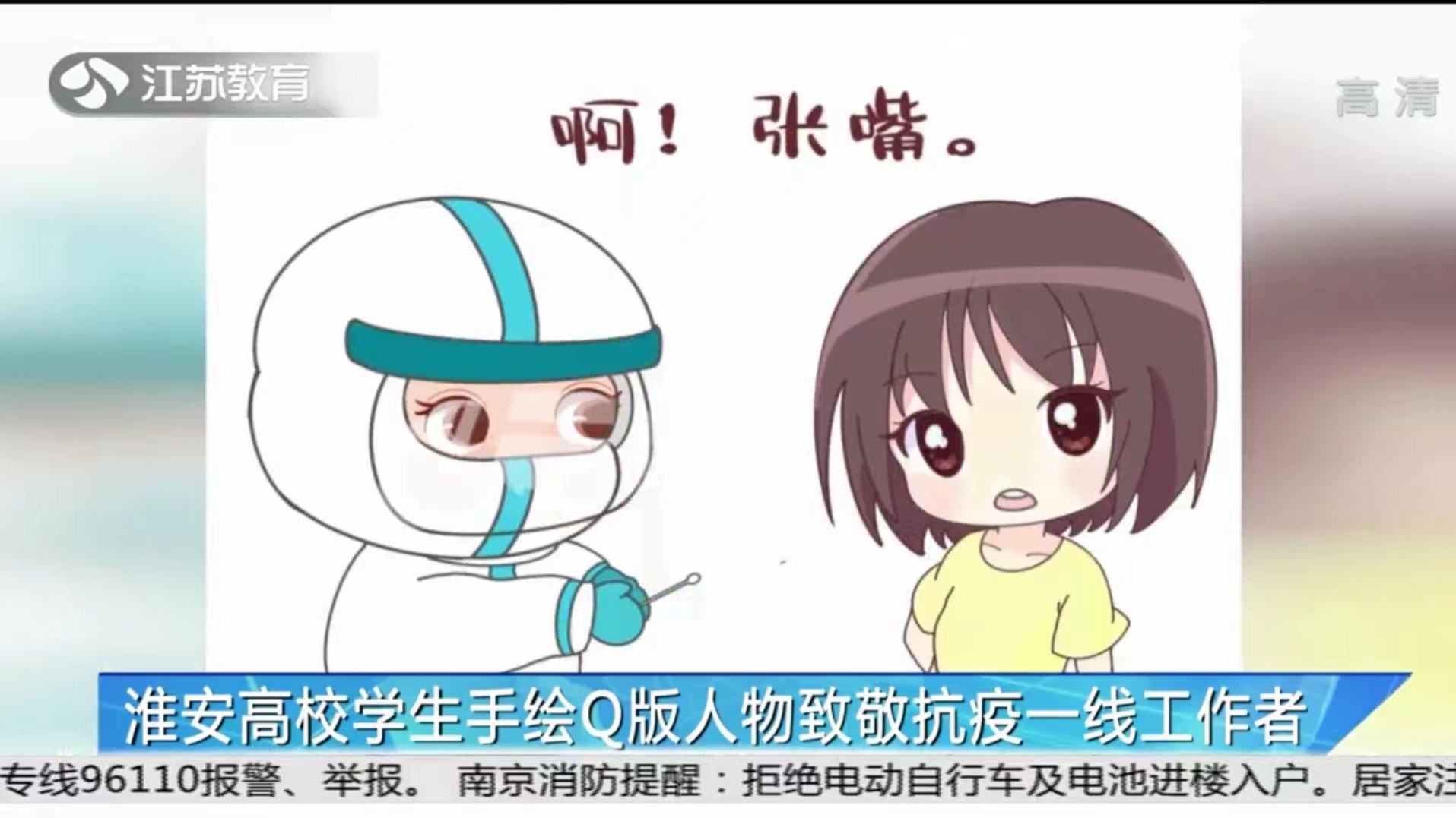 5月11日,江苏电视台教育频道专题报道我校学生绘制暖心小贴士和专属人物Q版卡通形象,用画笔述说情感传递力量,为抗疫加油。