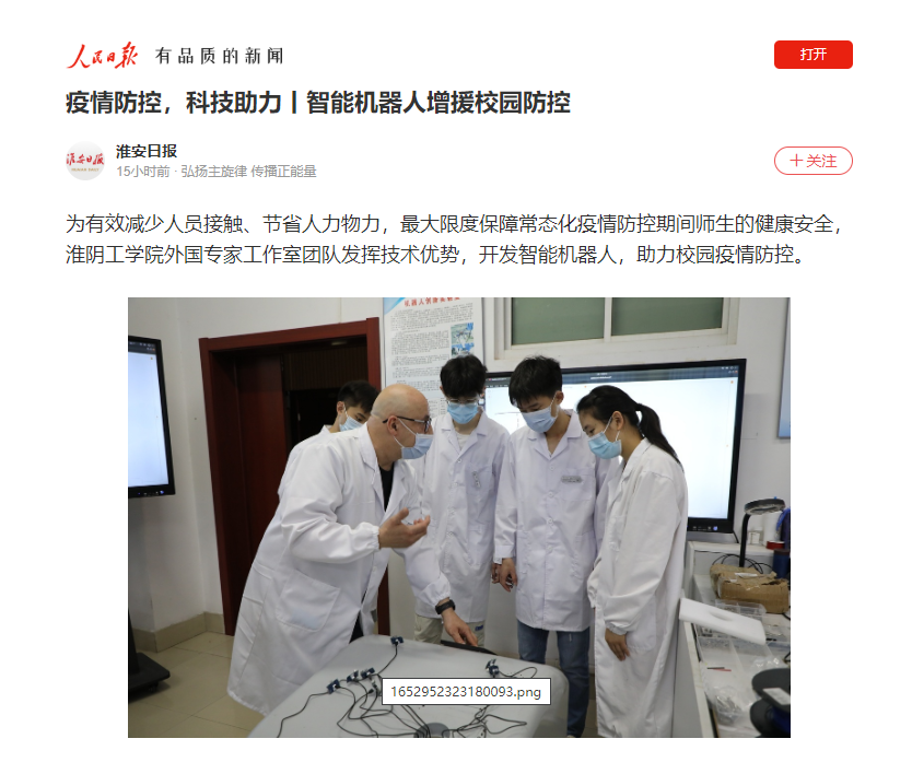 为有效减少人员接触、节省人力物力,最大限度保障常态化疫情防控期间师生的健康安全,淮阴工学院外国专家工作室团队发挥技术优势,开发智能机器人,助力校园疫情防控。