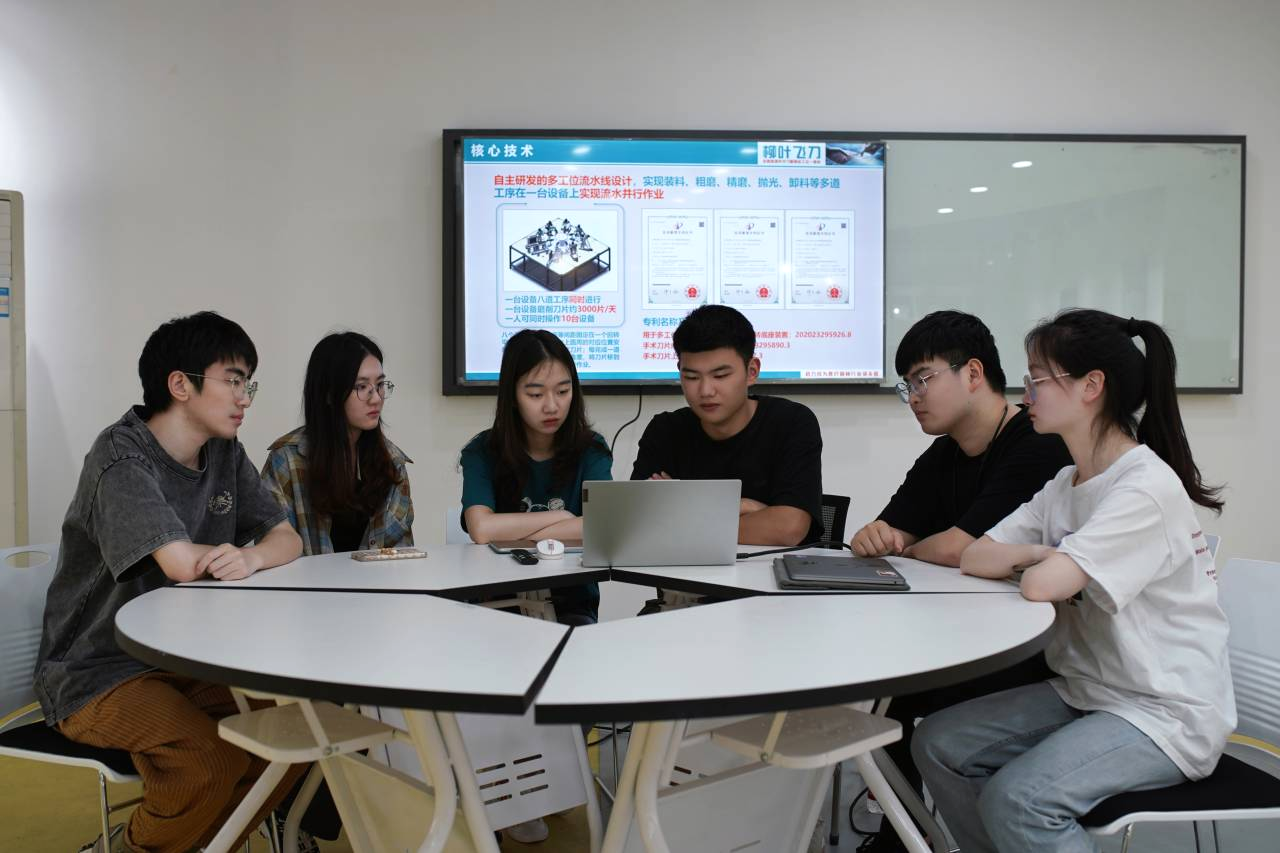 学生张志荣在团队中负责机械改造设计,他说,新改造出的手术刀磨削全工位一体机设置装料、上粗磨、下粗磨、上精磨、下精磨、上抛光、下抛光及卸料八道工序同时进行,生产合格率达99%,一台设备磨削刀片约3000片/天。