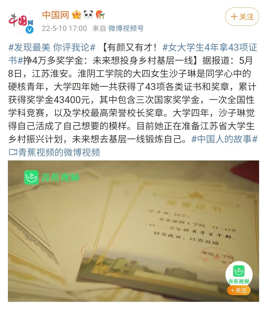 5月8日,江苏淮安。淮阴工学院的大四女生沙子琳是同学心中的硬核青年,大学四年她一共获得了43项各类证书和奖章,累计获得奖学金43400元,其中包含三次国家奖学金,一次全国性学科竞赛,以及学校最高荣誉校长奖章。大学四年,沙子琳觉得自己活成了自己想要的模样。目前她正在准备江苏省大学生乡村振兴计划,未来想去基层一线锻炼自己。