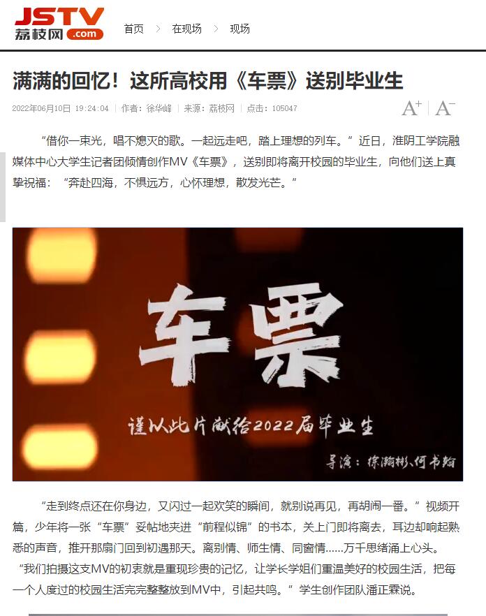 “希望学长学姐们将在淮工的美好记忆化作前进动力,乘坐理想的列车,抵达梦想的彼岸。”主创团队的成员们将满满的祝福,融入了《车票》这支MV中。