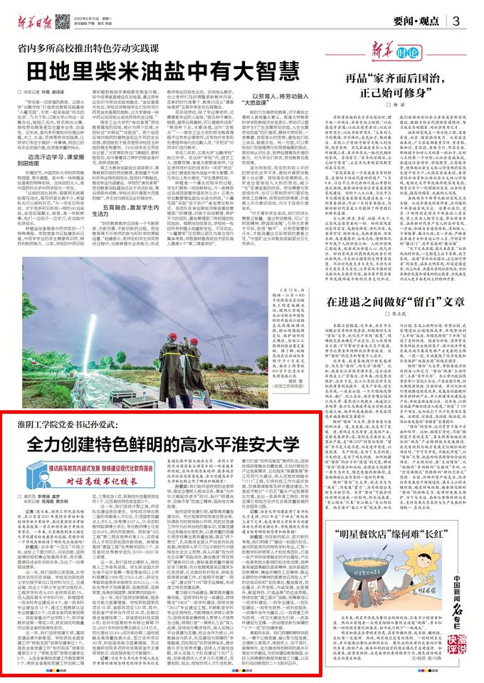 6月13日《新华日报》要闻刊发淮阴工学院党委书记孙爱武专访:全力创建特色鲜明的高水平淮安大学。