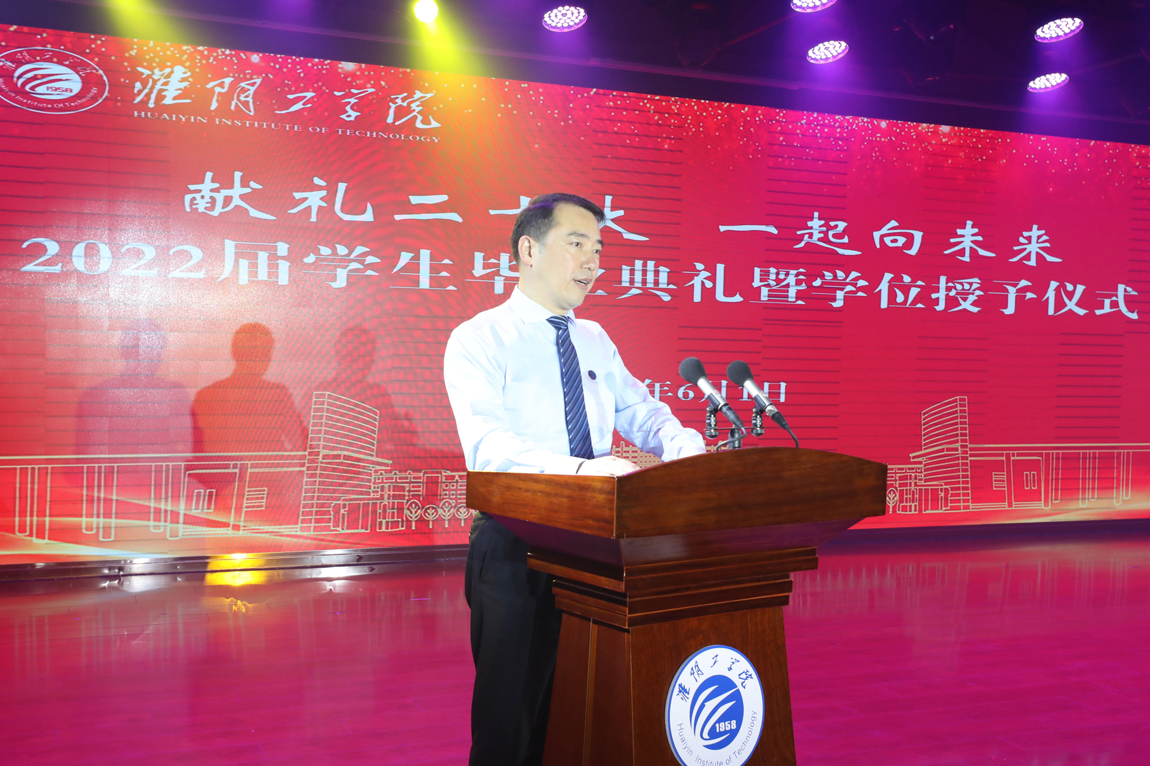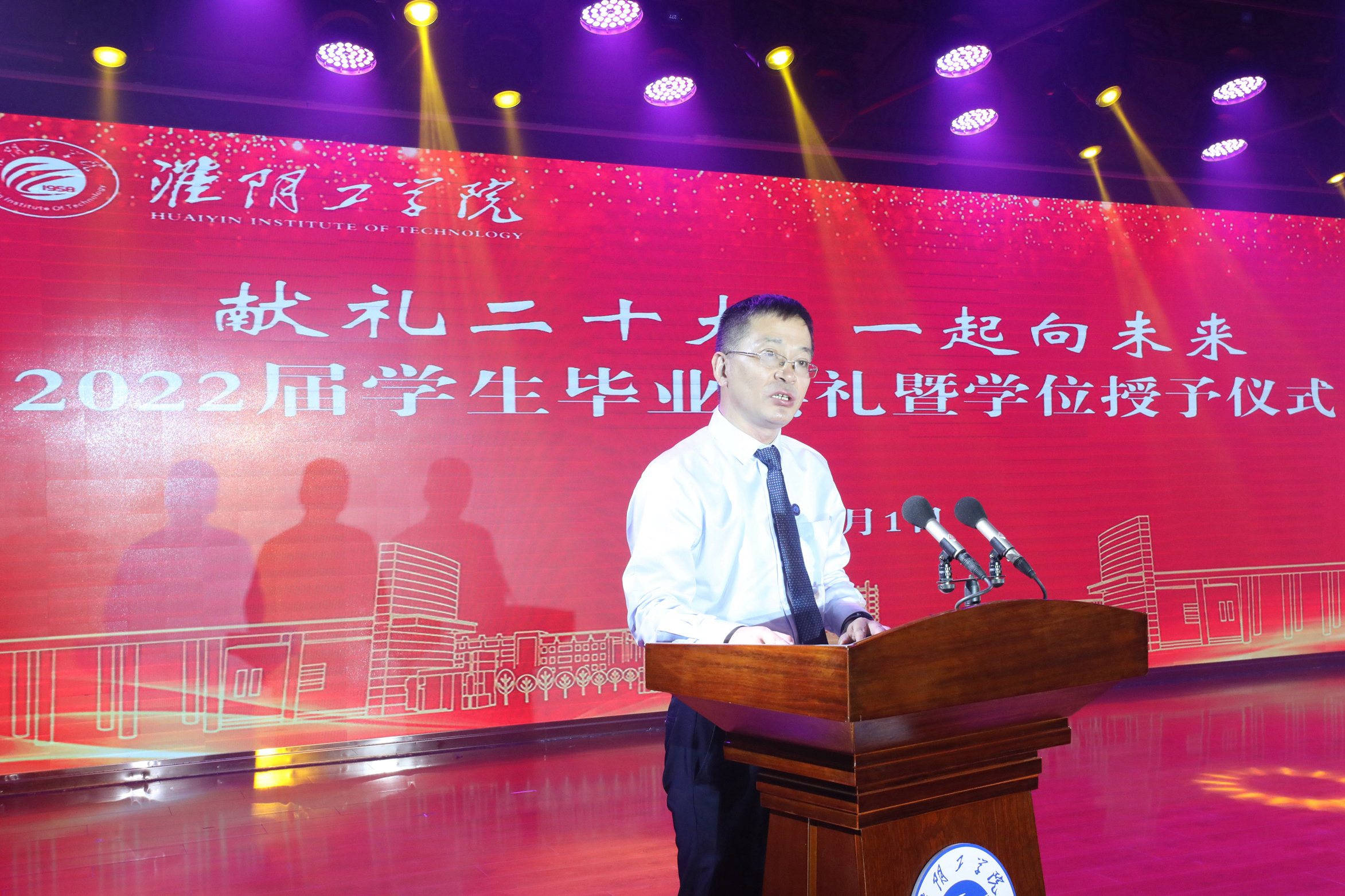 他激情感怀:春去秋来、寒暑几往,时光清浅、岁月含香,时序更替、岁物丰成,时间是最忠实的记录者。过去的几年,你们见证了党和国家发展历程中极不平凡的辉煌时刻。过去的几年,你们和淮工共同成长,参与、见证了学校的发展。过去的几年,你们刻苦努力,积极为美好明天蓄势,为祖国建设聚能,你们不负众望,创造了一个个高光时刻,交出了一份份成长、成才的出色答卷。风劲潮涌,自当扬帆破浪;任重道远,更需策马扬鞭。面向未来,更光荣的使命等待你们去担当,更伟大的奇迹等待你们去创造。言有尽,而情不可终。愿同学们秉持“明德尚学、自强不息”的淮工精神,传承弘扬周恩来精神,拼搏奋斗、笃行不怠,开启更加卓越的人生之路。
