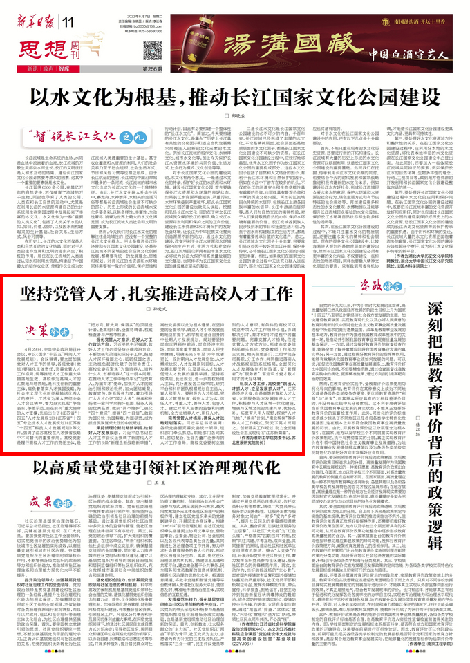 4月29日,中共中央政治局召开会议,审议《国家“十四五”期间人才发展规划》。会议强调,要全面加强党对人才工作的领导,各级党委(党组)要强化主体责任,完善党管人才工作格局,统筹推进人才工作重大举措落地生效。高校作为高端人才的汇聚地与培养地,是科技创新的重要主体,肩负着落实人才强国战略、为社会主义现代化新征程输送优秀人才的责任。江苏省为深入贯彻中央人才会议精神,着力夯实扛起“争当表率、争做示范、走在前列”重大使命的人才支撑,先后出台了《江苏省“十四五”人才发展规划》《江苏省“十四五”专业技术人才发展规划》《江苏省“十四五”科技人才发展规划》等文件,强调了江苏高校在人才强省战略中不可替代的重要作用。高校党委是履行高校人才工作的责任主体,是“把方向、管大局、保落实”的顶层设计者、最高组织者、全面协调者、权威检查者与严格考核者。
