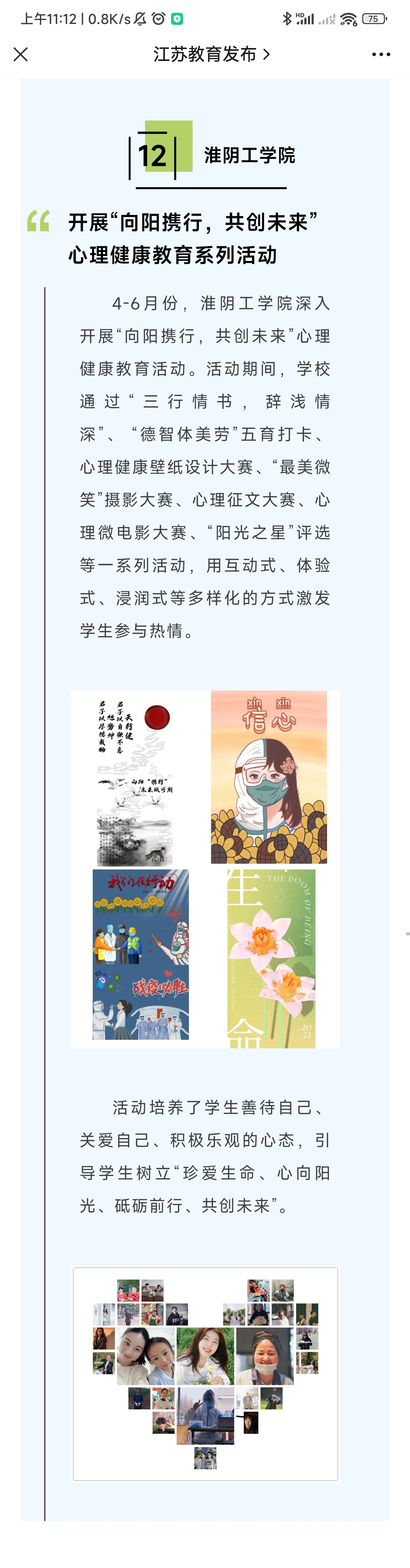4-6月份,淮阴工学院深入开展“向阳携行,共创未来”心理健康教育活动。活动期间,学校通过“三行情书,辞浅情深”、 “德智体美劳”五育打卡、心理健康壁纸设计大赛、“最美微笑”摄影大赛、心理征文大赛、心理微电影大赛、“阳光之星”评选等一系列活动,用互动式、体验式、浸润式等多样化的方式激发学生参与热情。