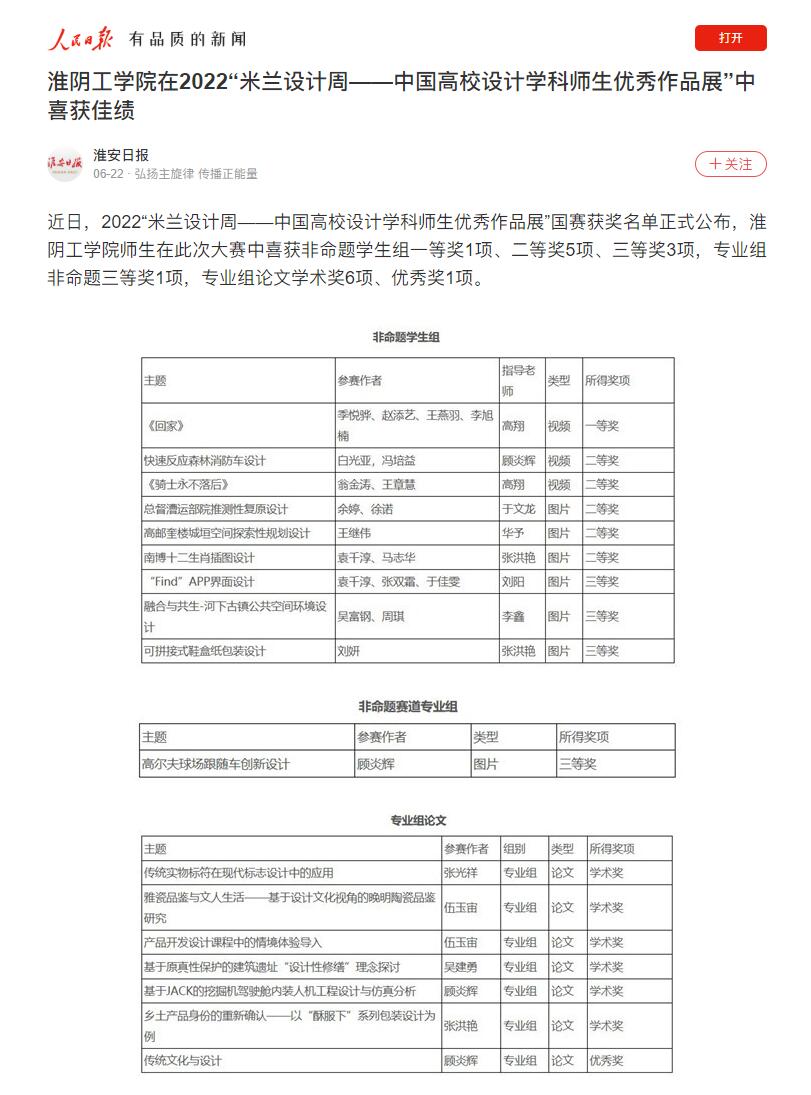近日,2022“米兰设计周——中国高校设计学科师生优秀作品展”国赛获奖名单正式公布,淮阴工学院师生在此次大赛中喜获非命题学生组一等奖1项、二等奖5项、三等奖3项,专业组非命题三等奖1项,专业组论文学术奖6项、优秀奖1项。