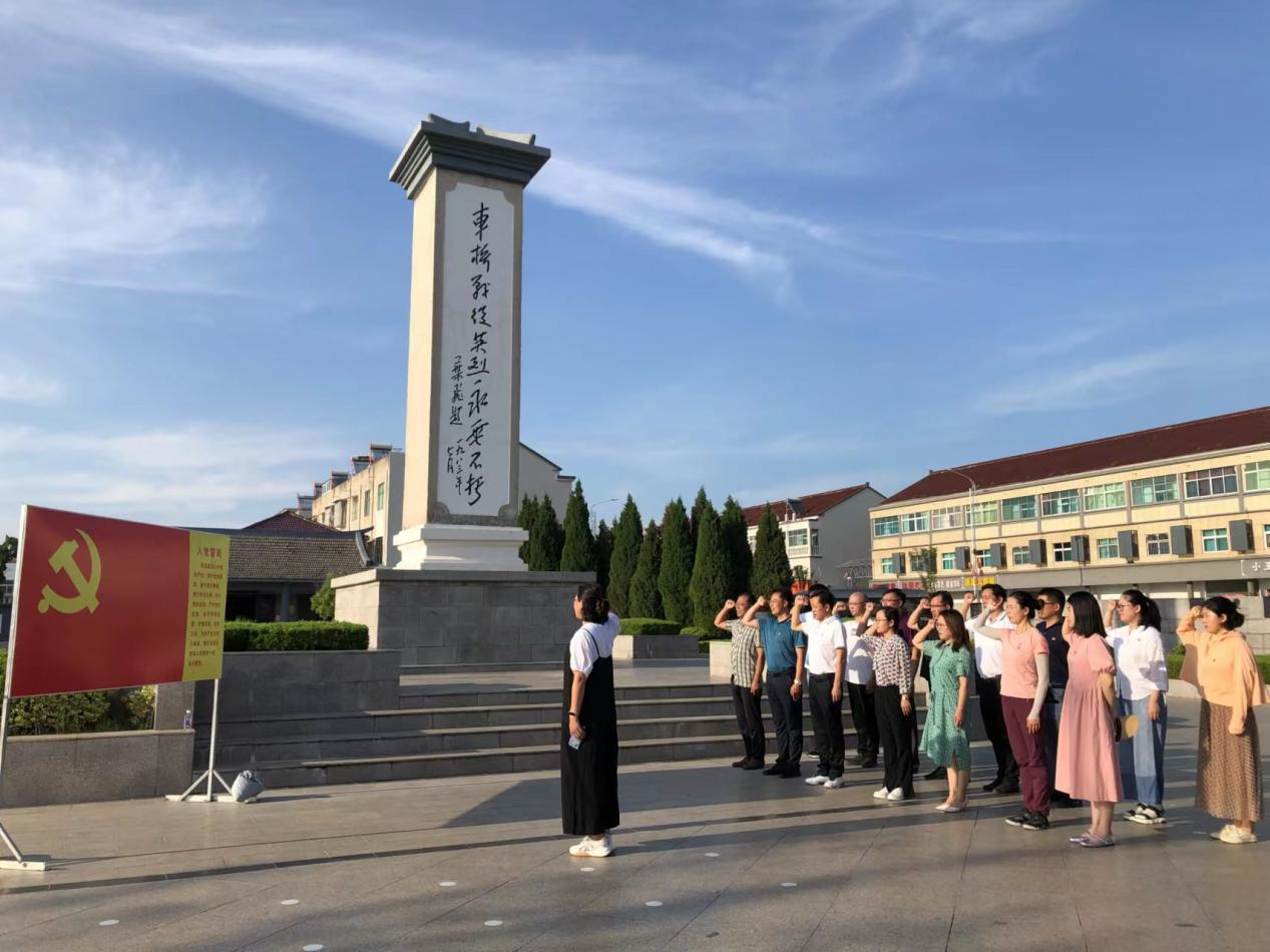 在车桥战役纪念广场前,全体党员面向车桥战役纪念碑三鞠躬,表达对革命先烈的敬仰之情,深切缅怀革命烈士的丰功伟绩,并面向党旗庄严宣誓,重温入党誓词,时刻牢记党的宗旨和初心使命。