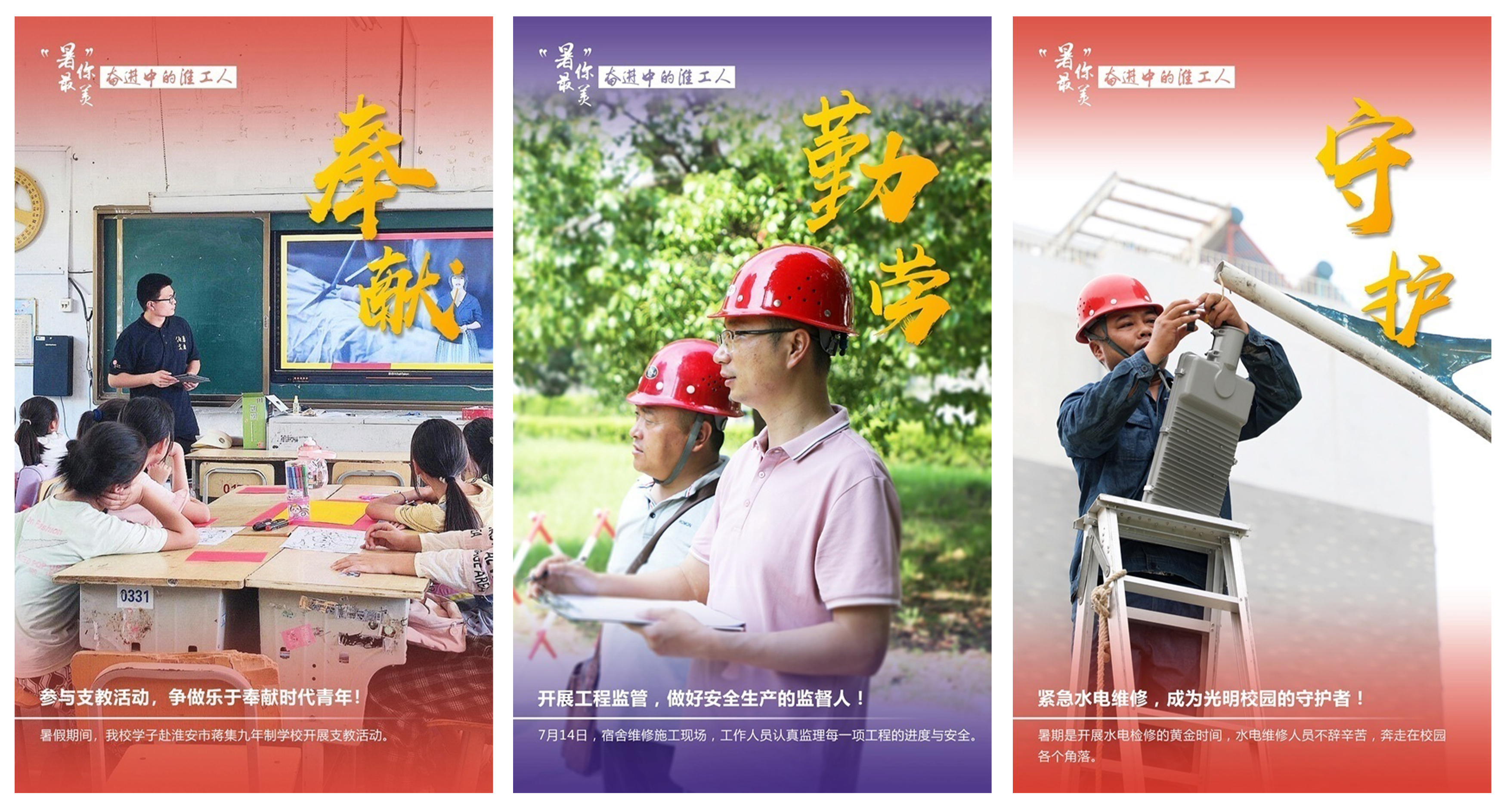炎炎烈日,火辣的太阳炙烤着大地,在淮工校园有这样一群人,他们奋战在各条战线上,不畏酷暑、坚守岗位、辛勤付出,劳作的身影是这个暑假最靓丽的风景线。平凡的坚守,不平凡的精神,向奋进中的淮工师生致敬!