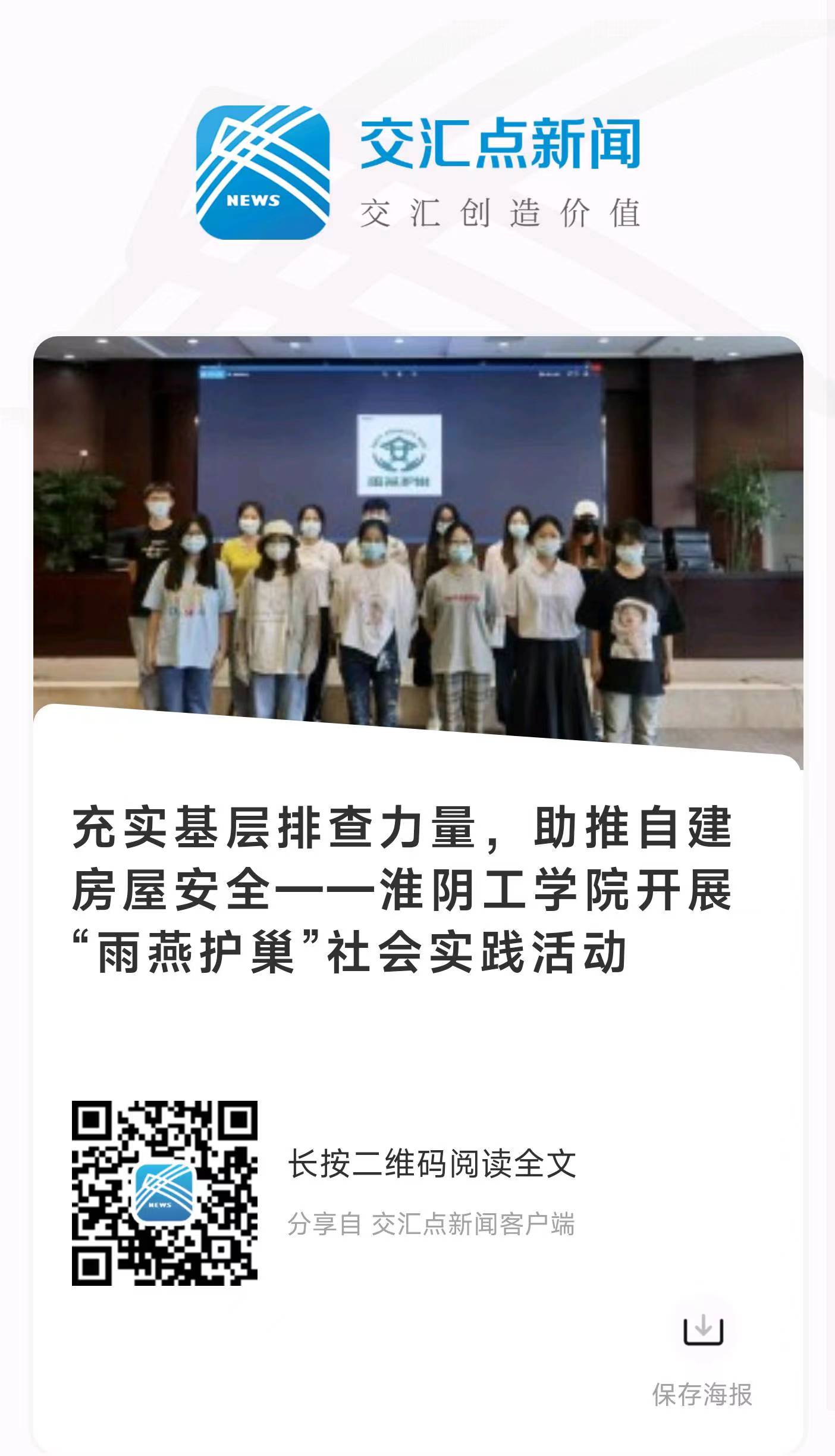 7月,淮阴工学院建筑工程学院积极响应省自建房安全专项整治工作领导小组办公室的号召,按照自愿参加的原则,组织51位暑期返乡同学组成“雨燕护巢”实践团队,分散在全省13个城市参加经营性自建房现场安全隐患排查工作。