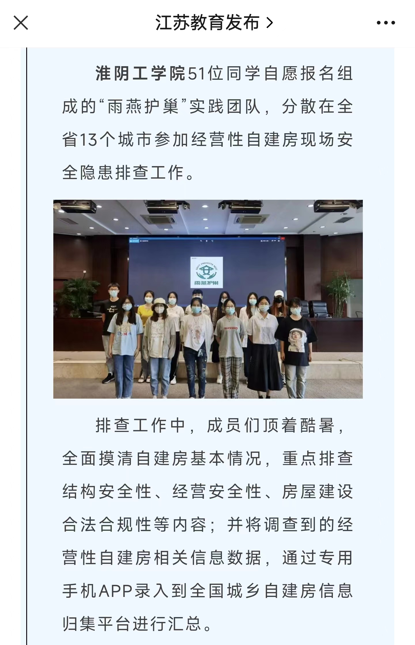淮阴工学院51位同学自愿报名组成的“雨燕护巢”实践团队,分散在全省13个城市参加经营性自建房现场安全隐患排查工作。