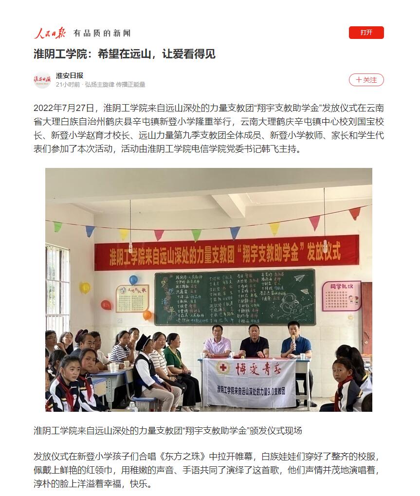 据悉,从2014年暑假开始,淮阴工学院“来自远山深处的力量”云南支教团就跨越5000里路来到云南省大理白族自治州鹤庆县辛屯镇新登小学,连续9年用爱心支教、心灵家访、成长陪伴、青春契约等形式探寻来自大山深处的力量,既是去当老师,也是去当学生,更懂得了“什么是梦想”,很好地把理论与实际统一了起来,做实干创新、知行合一的新时代好青年。