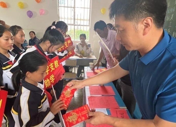 新登小学校长赵育才宣读了2022年淮阴工学院“翔宇支教助学金”获批名单,与韩飞一起为14名同学颁发助学金。