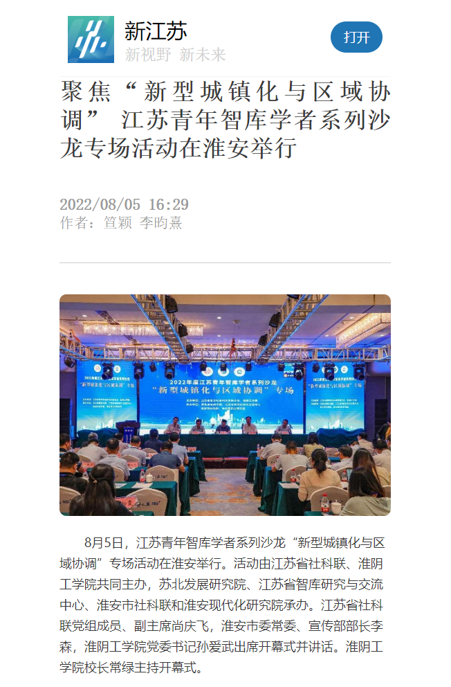 8月5日,江苏青年智库学者系列沙龙“新型城镇化与区域协调”专场活动在淮安举行。活动由江苏省社科联、淮阴工学院共同主办,苏北发展研究院、江苏省智库研究与交流中心、淮安市社科联和淮安现代化研究院承办。江苏省社科联党组成员、副主席尚庆飞,淮安市委常委、宣传部部长李森,淮阴工学院党委书记孙爱武出席开幕式并讲话。淮阴工学院校长常绿主持开幕式。