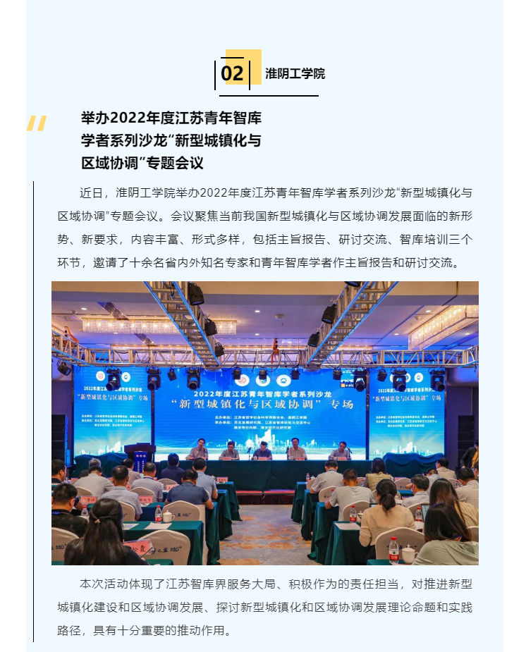 近日,淮阴工学院举办2022年度江苏青年智库学者系列沙龙“新型城镇化与区域协调”专题会议。会议聚焦当前我国新型城镇化与区域协调发展面临的新形势、新要求,内容丰富、形式多样,包括主旨报告、研讨交流、智库培训三个环节,邀请了十余名省内外知名专家和青年智库学者作主旨报告和研讨交流。