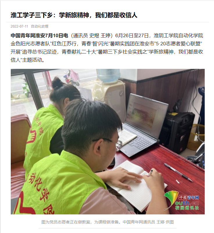 6月26日至27日,淮阴工学院自动化学院金色阳光志愿者队“红色江苏行,青春‘智’闪光”暑期实践团在淮安市“5·20志愿者爱心联盟”开展“追寻总书记足迹,青春献礼二十大”暑期三下乡社会实践之“学新旅精神,我们都是收信人”主题活动。