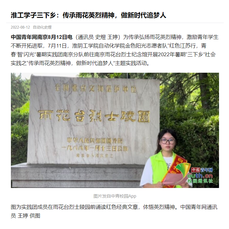 为传承弘扬雨花英烈精神,激励青年学生不断开拓进取,7月11日,淮阴工学院自动化学院金色阳光志愿者队“红色江苏行,青春‘智’闪光”暑期实践团南京分队前往南京雨花台烈士纪念馆开展2022年暑期“三下乡”社会实践之“传承雨花英烈精神,做新时代追梦人”主题实践活动。
