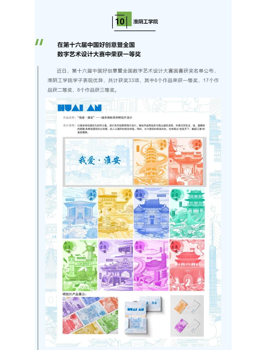 近日,第十六届中国好创意暨全国数字艺术设计大赛国赛获奖名单公布,淮阴工学院学子表现优异,共计获奖33项,其中8个作品荣获一等奖,17个作品获二等奖,8个作品获三等奖。