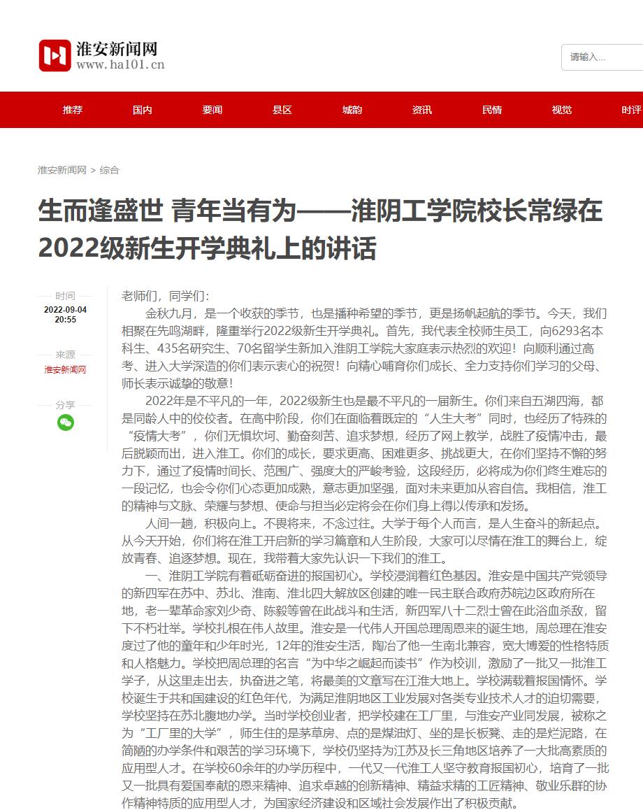 2022年是不平凡的一年,2022级新生也是最不平凡的一届新生。你们来自五湖四海,都是同龄人中的佼佼者。在高中阶段,你们在面临着既定的“人生大考”同时,也经历了特殊的“疫情大考”,你们无惧坎坷、勤奋刻苦、追求梦想,经历了网上教学,战胜了疫情冲击,最后脱颖而出,进入淮工。你们的成长,要求更高、困难更多、挑战更大,在你们坚持不懈的努力下,通过了疫情时间长、范围广、强度大的严峻考验,这段经历,必将成为你们终生难忘的一段记忆,也会令你们心态更加成熟,意志更加坚强,面对未来更加从容自信。我相信,淮工的精神与文脉、荣耀与梦想、使命与担当必定将会在你们身上得以传承和发扬。