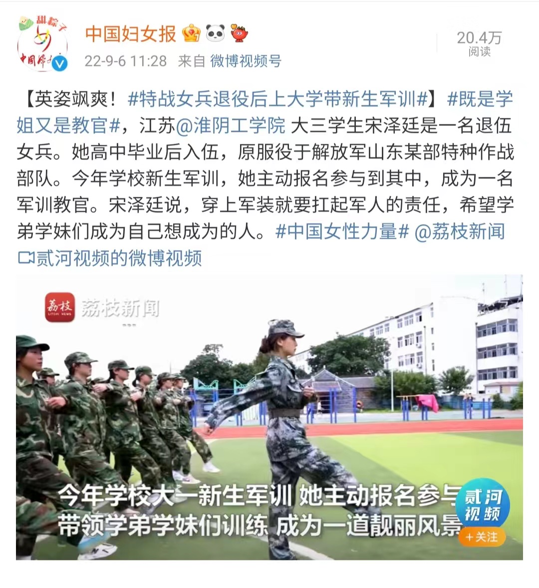 江苏淮阴工学院大三学生宋泽廷是一名退伍女兵。她高中毕业后入伍,原服役于解放军山东某部特种作战部队。今年学校新生军训,她主动报名参与到其中,成为一名军训教官。宋泽廷说,穿上军装就要扛起军人的责任,希望学弟学妹们成为自己想成为的人。