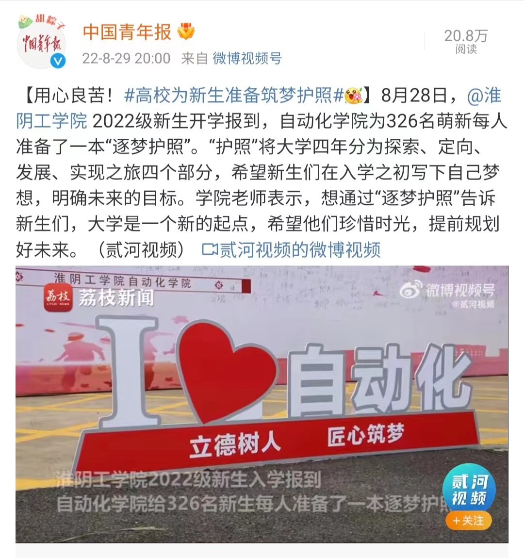 8月28日,淮阴工学院2022级新生开学报到,自动化学院为326名萌新每人准备了一本“逐梦护照”。“护照”将大学四年分为探索、定向、发展、实现之旅四个部分,希望新生们在入学之初写下自己梦想,明确未来的目标。学院老师表示,想通过“逐梦护照”告诉新生们,大学是一个新的起点,希望他们珍惜时光,提前规划好未来。