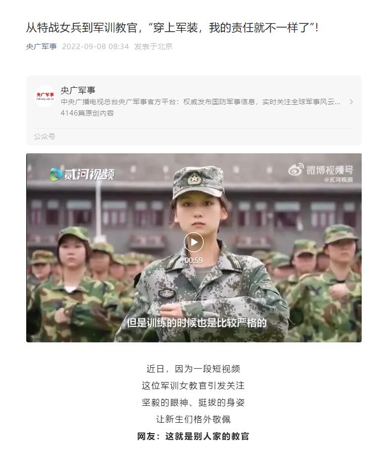 9月8日,央广军事报道淮阴工学院大三学生宋泽廷,从“特战女兵到军训教官”的事迹。