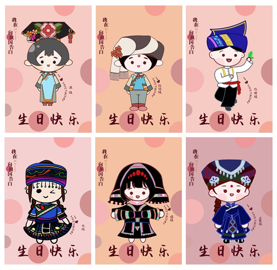 “每一个卡通人物身上不仅都穿着富有当地特色的服饰,还伴有‘我在HYIT向祖国告白’‘生日快乐’等字样。民族卡通画包含汉族、壮族、苗族、土家族、布依族等民族。”王泽伟介绍,团队成员加班加点画人物、做模板,为的就是能在国庆前完成,为祖国母亲献上一份真挚的礼物。同时,淮工民族人物卡通画电子版前期在学校相关平台上线后,深受学生喜爱,纷纷表示画得很形象,感觉很温暖。