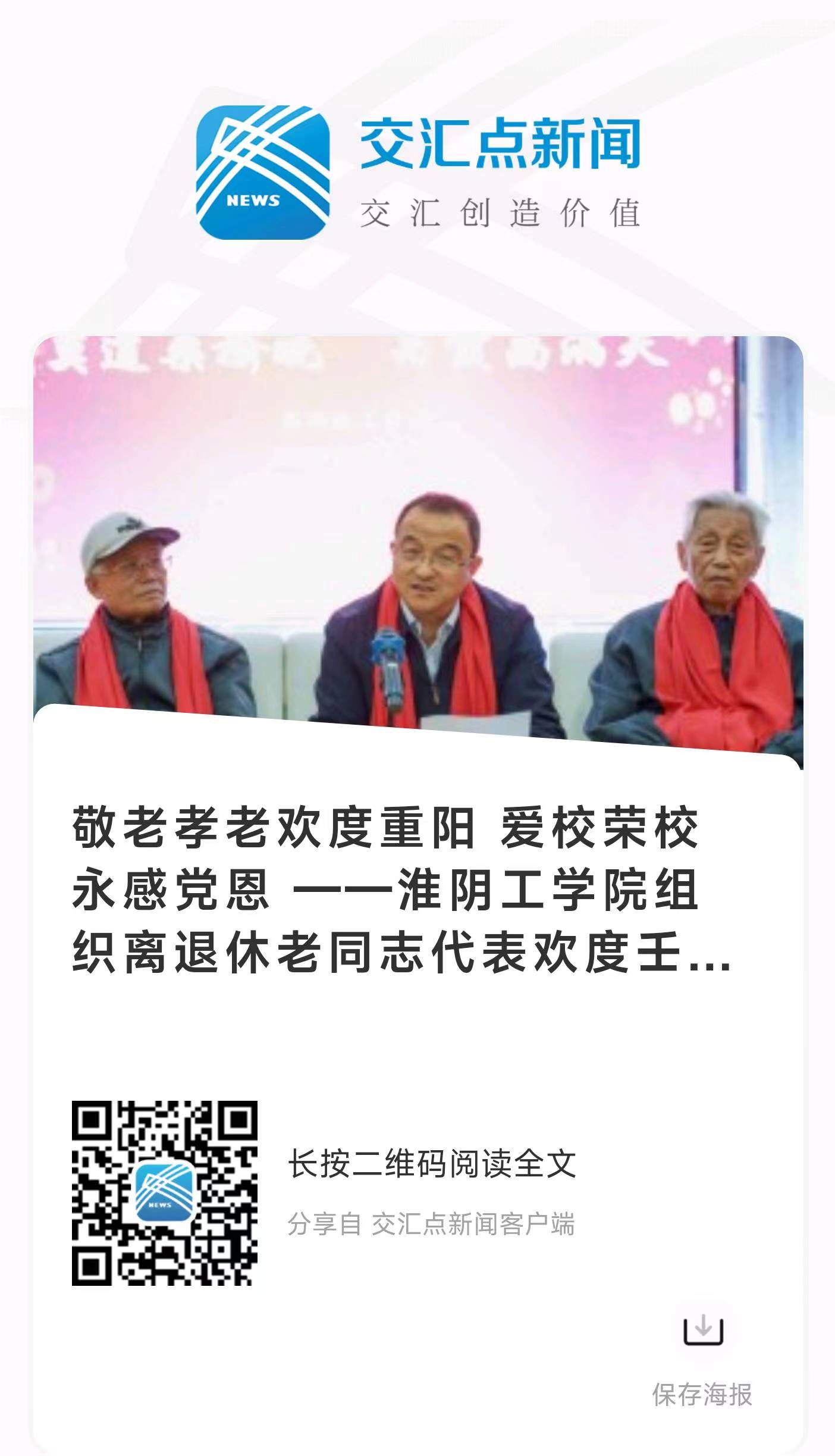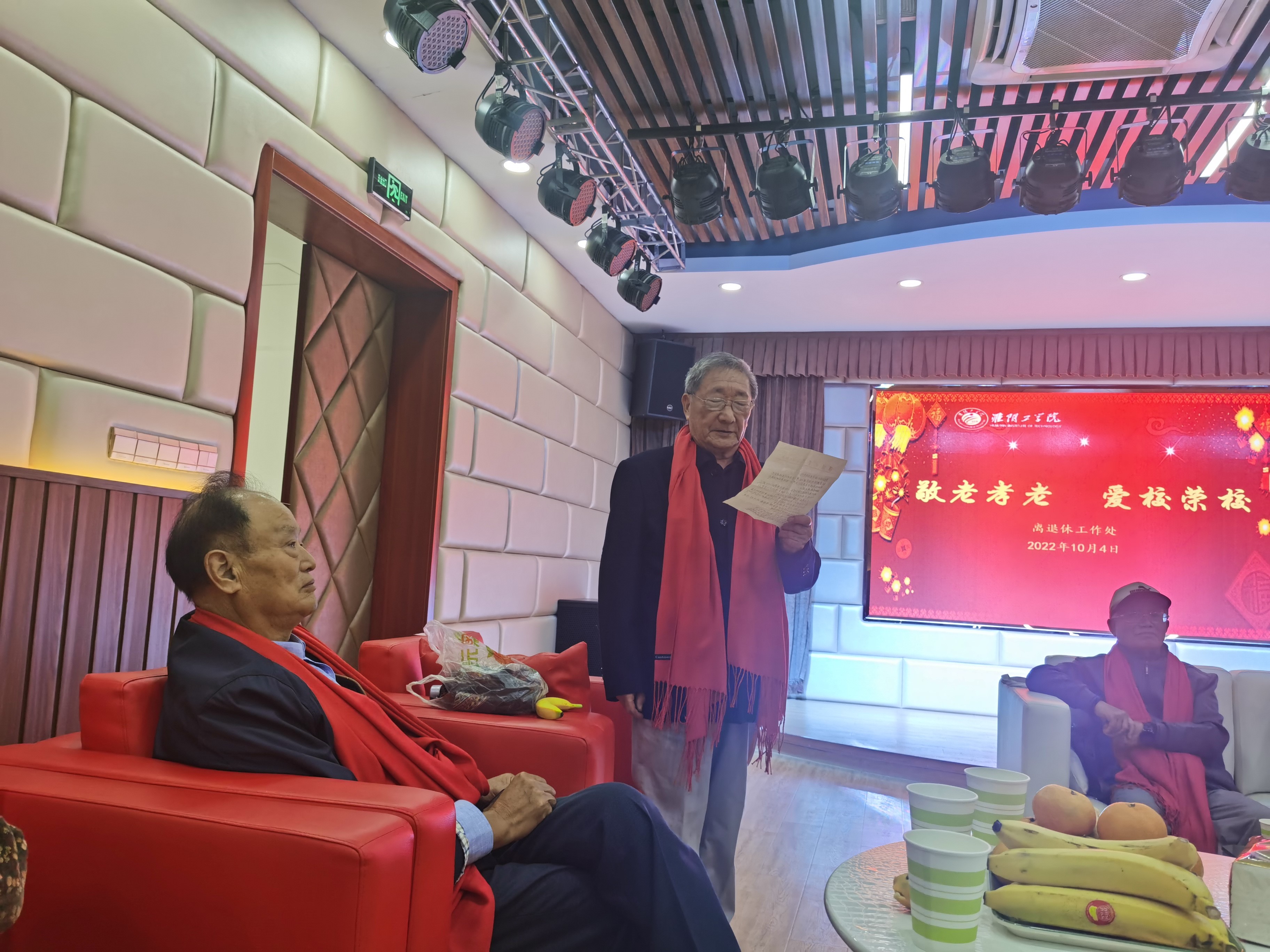 在座谈交流时,老同志们内心充满喜悦,兴高采烈分享自己的感想感言。退休老员工王锦龙现场赋诗“莫道夕阳催白发,落霞晚照颂辉煌”咏怀励志。退休老教授蒋中海感恩党和国家“健康中国”战略实施带来的全民健康,感恩学校对老同志无微不至的关心关怀。退休老党员张振祥深情回忆当年在淮工不懈奋斗的艰苦岁月,对今天淮工的发展深感自豪。长期从事学校关工委工作、80高龄依旧精神矍铄的顾寿康老人表示,要把一代一代淮工人在立德树人办学实践中形成的“明德尚学,自强不息”的淮工精神接续传承下去。大家一致表示要快乐生活、老有所为。
