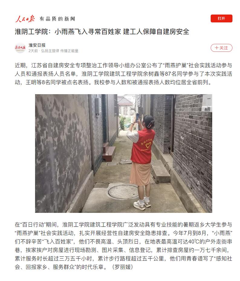 近期,江苏省自建房安全专项整治工作领导小组办公室公布了“雨燕护巢”社会实践活动参与人员和通报表扬人员名单,淮阴工学院建筑工程学院余树鑫等87名同学参与了本次实践活动,王明等8名同学被点名表扬。我校参与人数和被通报表扬人数均位居全省前列。