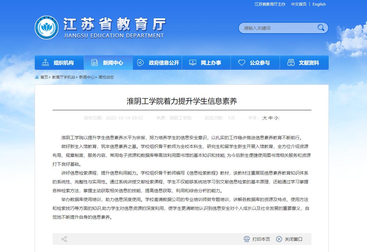 淮阴工学院以提升学生信息素养水平为宗旨,努力培养学生的信息安全意识,以扎实的工作稳步推进信息素养教育不断前行。