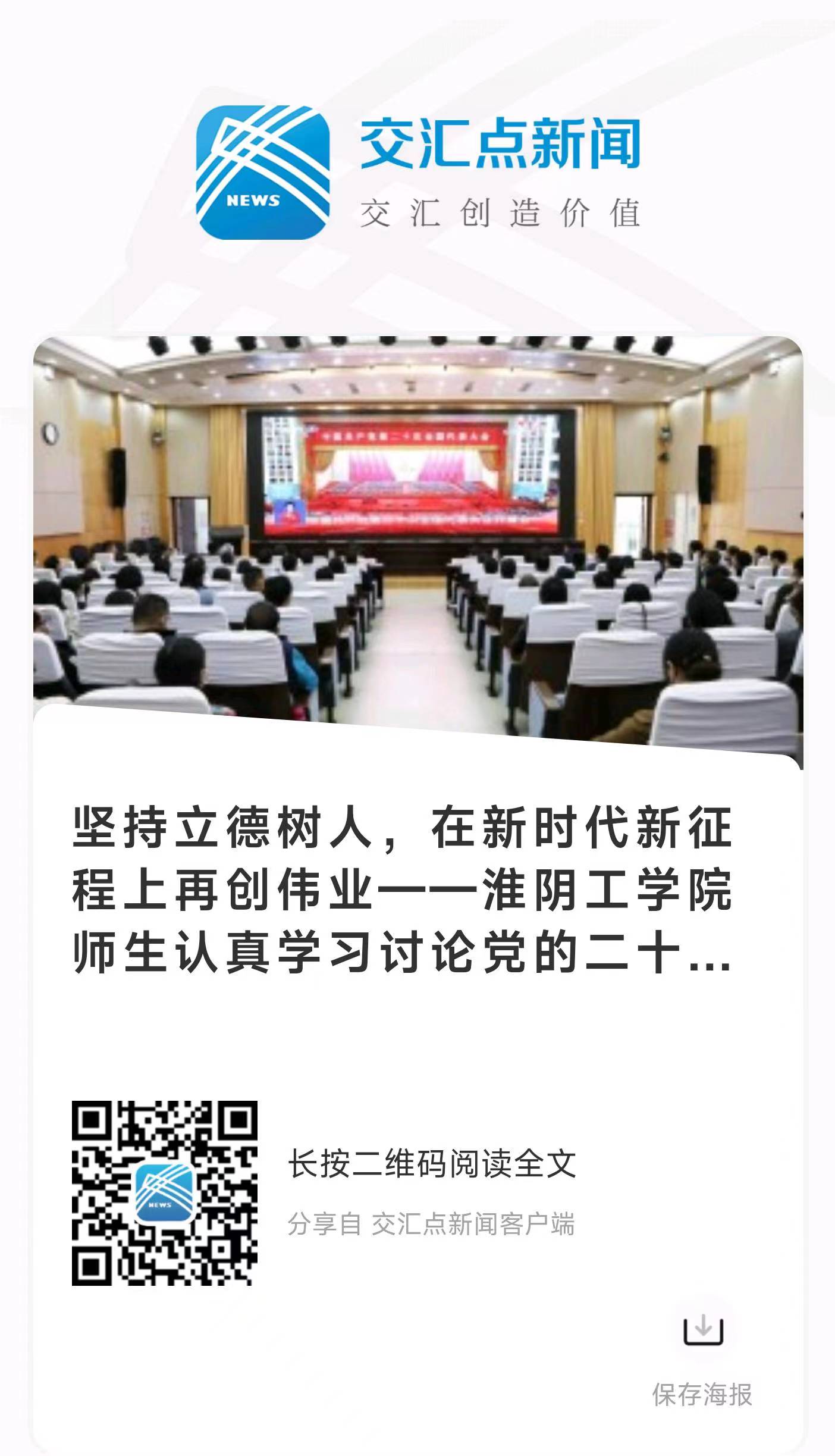 为深入学习贯彻党的二十大精神,淮阴工学院组织党员师生在校内主会场和分会场集中收听收看开幕会直播。全体校领导,机关党委所属全体中层干部,校民主党派和统战团体主要负责人、市政协委员,马克思主义学院全体教师在枚乘路校区翔宇楼二楼报告厅主会场收听收看现场直播。各二级党组织班子成员,支部书记,科级干部,师生党员代表在分会场收听收看直播。