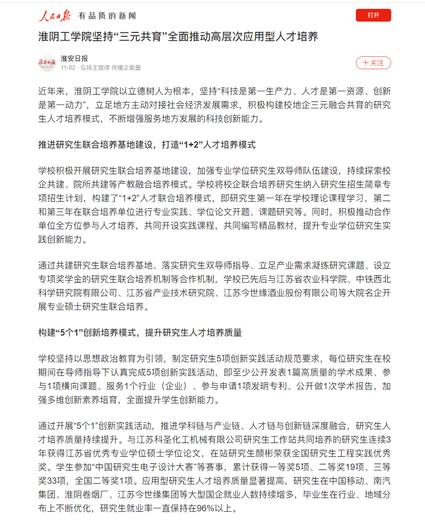 近年来,淮阴工学院以立德树人为根本,坚持“科技是第一生产力、人才是第一资源、创新是第一动力”,立足地方主动对接社会经济发展需求,积极构建校地企三元融合共育的研究生人才培养模式,不断增强服务地方发展的科技创新能力。