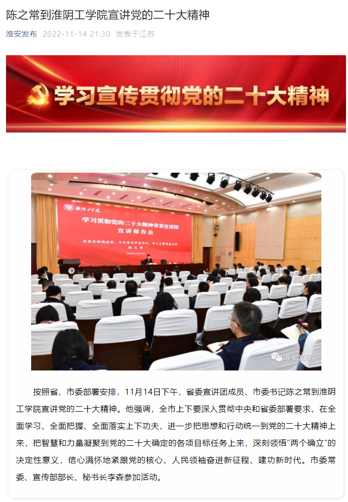 按照省、市委部署安排,11月14日下午,省委宣讲团成员、市委书记陈之常到淮阴工学院宣讲党的二十大精神。他强调,全市上下要深入贯彻中央和省委部署要求,在全面学习、全面把握、全面落实上下功夫,进一步把思想和行动统一到党的二十大精神上来,把智慧和力量凝聚到党的二十大确定的各项目标任务上来,深刻领悟“两个确立”的决定性意义,信心满怀地紧跟党的核心、人民领袖奋进新征程、建功新时代。市委常委、宣传部部长、秘书长李森参加活动。