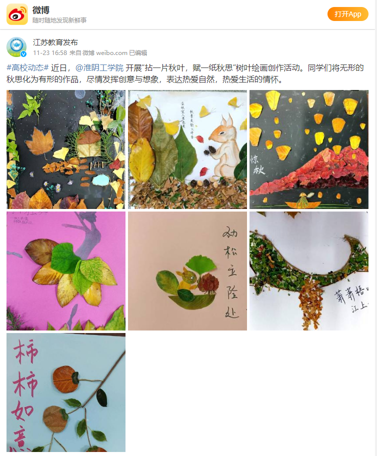 近日,淮阴工学院开展“拈一片秋叶,赋一纸秋思”树叶绘画创作活动。同学们将无形的秋思化为有形的作品,尽情发挥创意与想象,表达热爱自然,热爱生活的情怀。