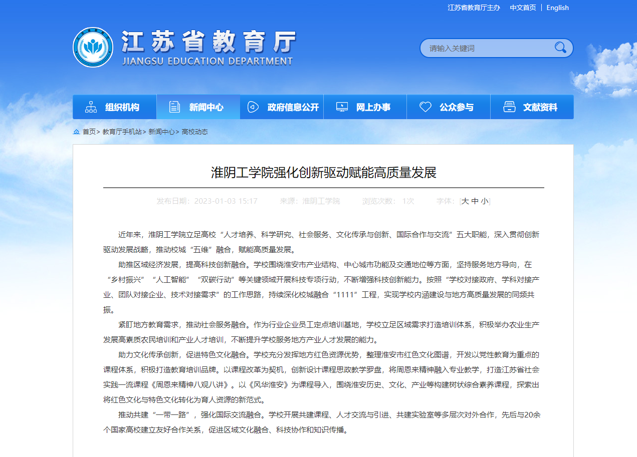 近年来,淮阴工学院立足高校“人才培养、科学研究、社会服务、文化传承与创新、国际合作与交流”五大职能,深入贯彻创新驱动发展战略,推动校城“五维”融合,赋能高质量发展。