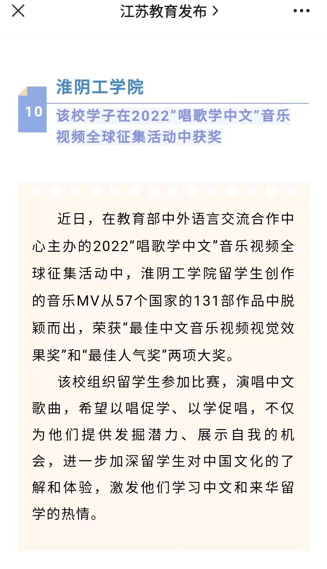 近日,在教育部中外语言交流合作中心主办的2022“唱歌学中文”音乐视频全球征集活动中,淮阴工学院留学生创作的音乐MV从57个国家的131部作品中脱颖而出,荣获“最佳中文音乐视频视觉效果奖”和“最佳人气奖”两项大奖。