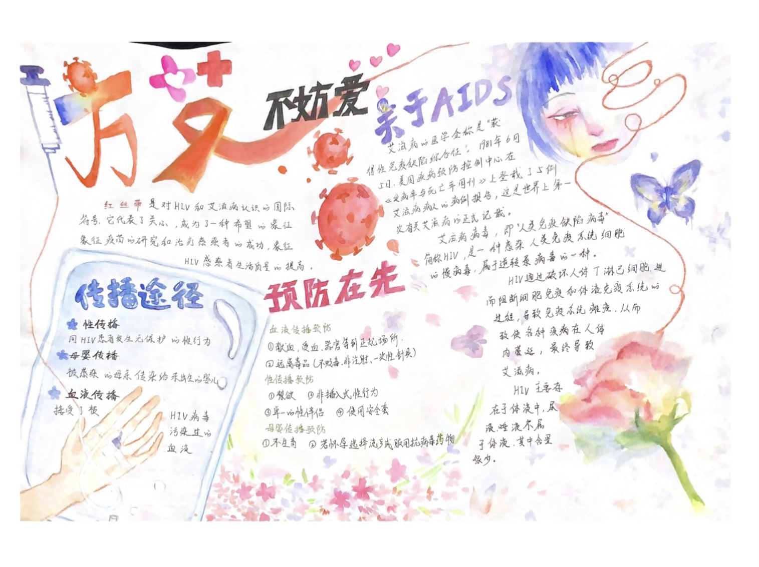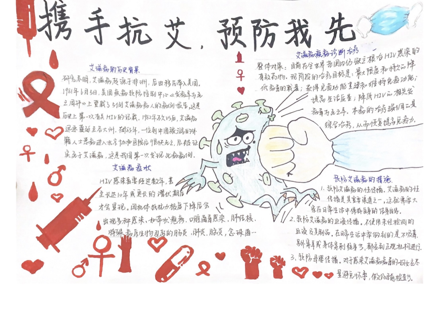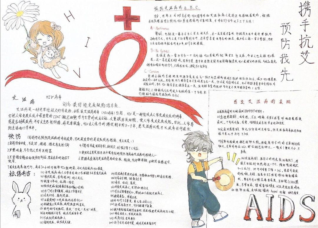 在本次比赛活动中,同学们积极踊跃的报名参加,围绕“携手抗艾,预防我先”为主题展开联想抒发自己的灵感,用心设计创作。参赛同学们投稿的logo设计作品构思灵巧、图形新颖、简洁明快,有艺术感染力;手抄报作品内容积极向上,具备一定知识性、趣味性。