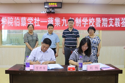 7月12日,2021年我校伯藜学社---蒋集九年制学校暑期支教签约仪式在三树镇蒋集九年制学校举行。淮阴区三树镇党委委员、组织委员蒋海波、 蒋集九年制学校校长、书记万开军、我校学生工作处副处长王启松、校学生资助管理中心主任刘畅等出席签约仪式。