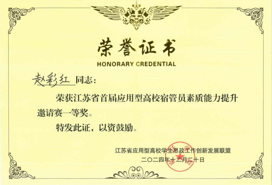 本次比赛旨在提升全省应用型高校宿管员的整体素质和服务能力,推动学生公寓管理工作的规范化、专业化发展。比赛历时两天,共包括“基础知识测试”、说一说我和学生“屋檐下的故事”和“突发事件处理情景展示”三个环节。在比赛过程中,赵彩红以饱满的热情、专业的态度和扎实的技能,赢得了评委和观众的一致好评,最终在来自14所省内应用型高校的14名宿管员中脱颖而出,荣获一等奖。