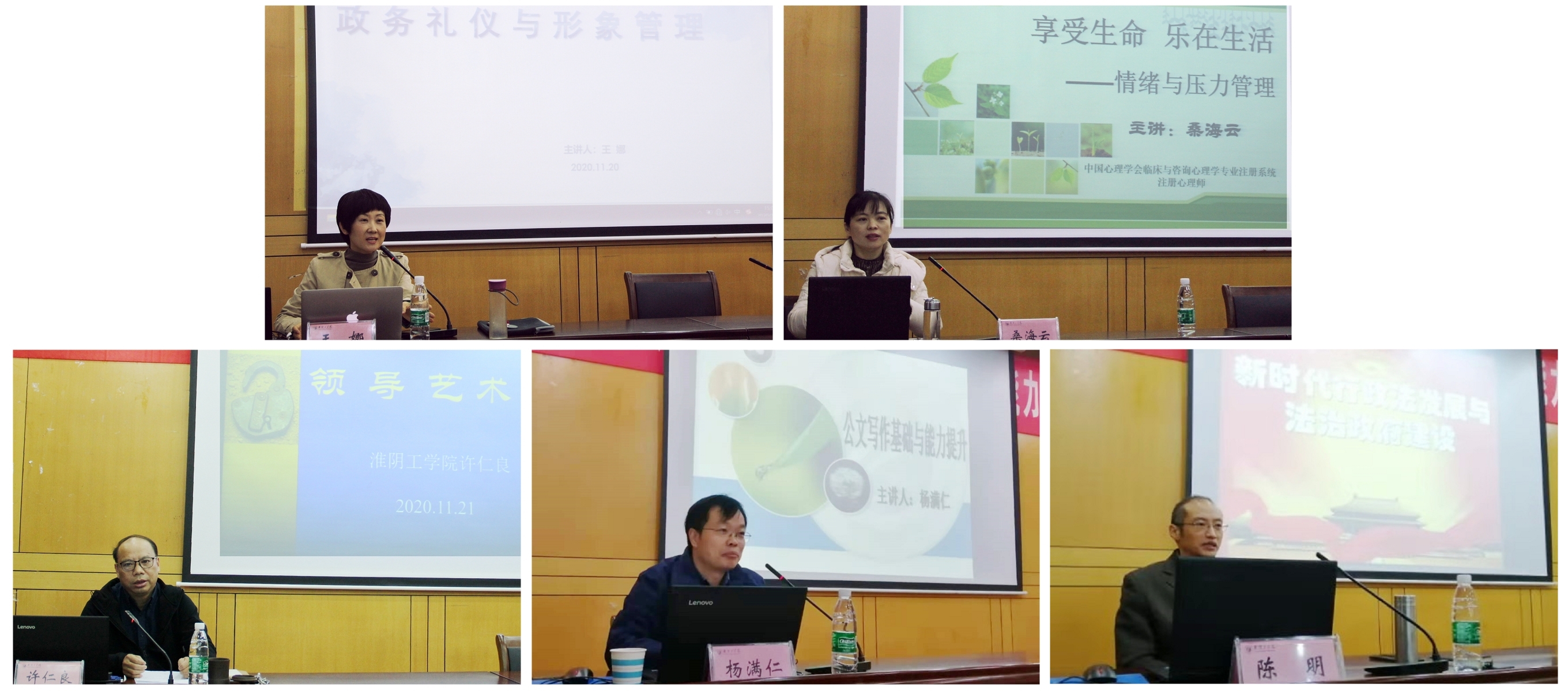 本次集中教学为期3天,邀请了淮阴工学院人文学院副教授王娜,体育部党总支书记桑海云,继续教育学院院长许仁良,组织部、统战部副部长杨满仁,人文学院副院长陈明等专家,分别作题为“政务礼仪与形象管理”“情绪管理与压力调节”“领导艺术”“公文写作基础与能力提升”“新时代行政法与法治政府建设”的5场专题讲座。