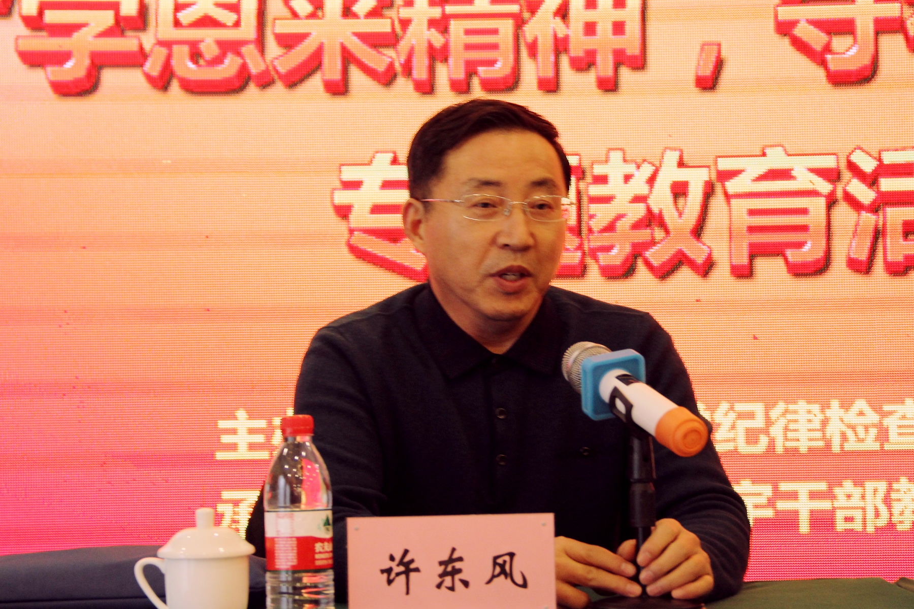 许东风代表学校欢迎苏大纪检监察同行来到总理的故乡淮安参加本次专题教育活动,对本次活动的顺利开班表示诚挚的祝贺,并简要介绍了学校的发展情况及近年来学校纪检监察工作情况。他表示,为了承办好此次培训,我校翔宇干部教育学院对培训方案、现场教学、餐饮住宿及疫情防控等工作做了细致准备和科学安排,确保专题教育活动取得实效。也希望双方以此次专题教育活动为契机,进一步加强沟通交流,不断拓展合作、增强友谊。